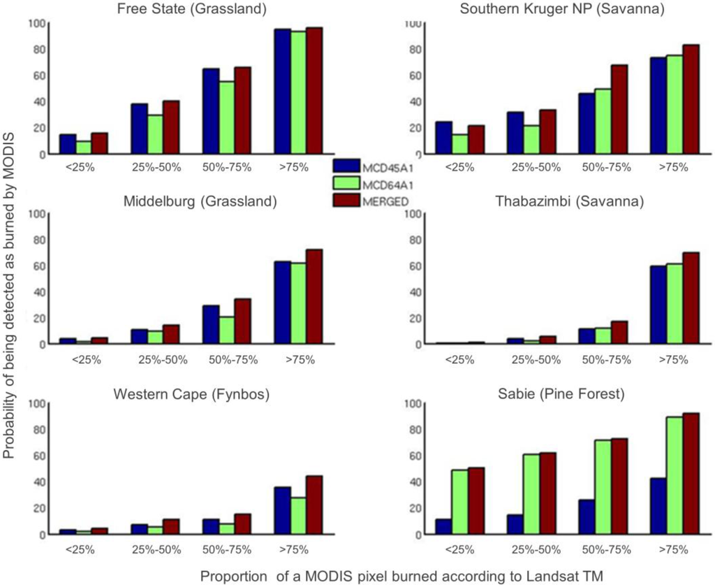 Figure 5 clearly illustrates how the probability of burned area identification increases with a proportion of the 500-m MODIS pixel burned (i.e., <25%, 25%–50%, 50%–75% and ≥75%). The MCD45A1 product showed higher detection probabilities, compared to MCD64A1, across all burned area proportions in the Western Cape (3.0%–35.4%), Middelburg (3.8%–62.3%) and Free State (14.6%–94.8%). On the other hand, the MCD64A1 product showed higher (i.e., 48.7%–89.2%) probabilities of detection over all burned area proportions relative to the MCD45A1 product (i.e., 10.9%–42.1%) in the forestry plantations of Sabie. Further, the MCD64A1 product presented higher detection probabilities for burned area fractions >50% of a MODIS pixel in the Southern Kruger (49.2%–74.8%) and Thabazimbi (12.0%–61.0%) sites characterized by the savanna biome. Conversely, the MCD45A1 product appeared more reliable than MCD64A1 in detecting burned area fractions <50% of a MODIS pixel with probabilities in the range 24.2%–31.8% and 0.3%–3.9%, corresponding to the aforementioned sites. The merged product had slightly higher probabilities of detection than the highest one of the individual MCD45A1 and MCD64A1 products, in all six validation sites (Figure 5). In particular, the merged product indicated detection probabilities for MODIS sub-pixel burns >50% in the range 15.3%–44.3%, 39.9%–71.5%, 65.7%–95.9%, 72.4%–92.0%, 16.2%–69.9% and 67.2%–82.9% in the Western Cape, Middelburg, Free State, Sabie, Thabazimbi and Southern Kruger NP sites, respectively.