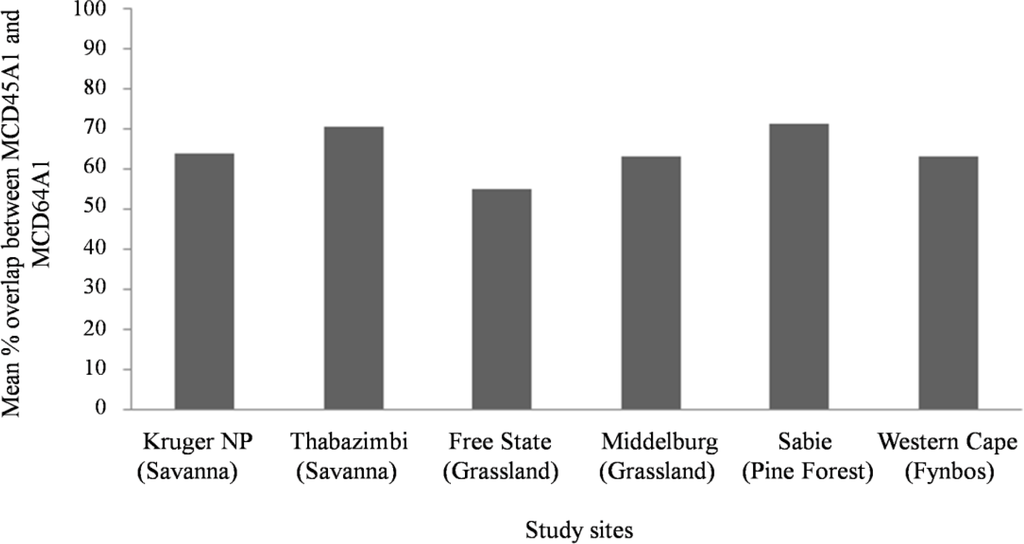Figure 6 illustrates the mean percent concurrence of burned pixels between the MCD45A1 and MCD64A1 products across the individual study sites during the period 2002–2011. Overall, more than 50% of the burned pixels concur between the MCD45A1 and MCD64A1 products in all the sites. In decreasing order, the products revealed the mean percentage concurrences of 71.13% (Sabie), 70.65% (Thabazimbi) 63.99% (Southern Kruger NP) 63.17% (Middelburg) 62.89% (Western Cape) and 54.92% (Free Sate). Further investigation is needed on the non-overlapping burned pixels.