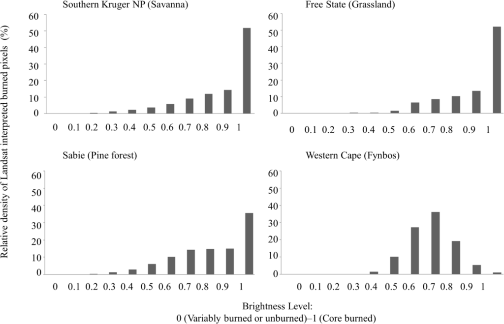 In the Western Cape site (Figure 2), the majority of burned area sizes were in the range of 0.36–1,000 ha, as well as a few exceptional burns greater than 1,000 ha, which were characterized by simple homogeneous shapes. This site encompass the fynbos biome that includes a mixture of fine-leaved low shrubs coupled with a sparse grass layer and is marked by winter rainfall and a summer season of burning, generally between December and April [30]. The derived Oe for both products suggests that a significant portion of the burned area in the fynbos biome remained undetected (Table 4). This could be because spectral changes pre- to post-fire are not very large in this vegetation. For example, Figure 7 depicts a quantitative measure of the brightness level for the reference burned pixels over four selected sites, where core burned pixels have high values of the brightness level (close to one). The Western Cape site, above all, suggests a rather variable contrast from burns showing uni-modal distribution of values centered on 0.7 (Figure 7). In particular, the validation results (Table 5) based on MODIS pixels with fractional burns ≥50% show that the MCD45A1 and MCD64A1 product detected a burned area with low Ce of 4.08% and 3.12%, respectively. This outcome indicated a minor difference of about 4% and 12% compared to the derived Ce [21], corresponding to the MCD45A1 and MCD64A1 products during the 2007 fire season. Similarly, our validation results (Table 5) indicated that MCD45A1 detected more (i.e., lower Oe) of the burned fynbos than MCD64A1, which is also depicted in the detection rates across the individual burned areas below 500 ha (Table 4) and the probability of detection for MODIS pixel burned area proportions of 25%, 50% and 75% (Figure 5). Furthermore, similar detection rates (Table 4) are observed for both products over burned area sizes greater than 500 ha (and since only seven out of 668 individual burns in the Western Cape site were greater than 1,000 ha, with 4,105 ha being the largest burn), and this implies that we could expect the Oe for the MCD64A1 product to improve over larger burned area sizes in the fynbos biome [21].