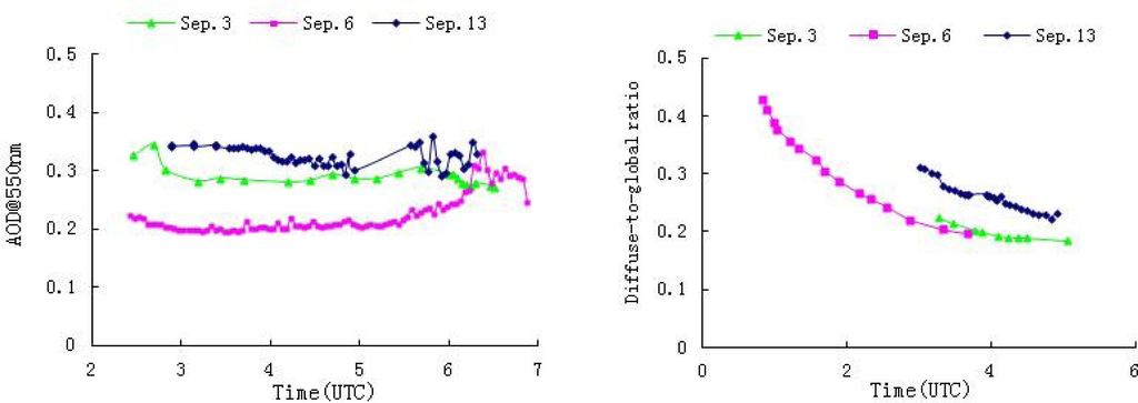 Aerosol optical depth (AOD) at 550 nm (Left) and diffuse-to-global irradiance ratios (Right) during Dunhuang experiments.