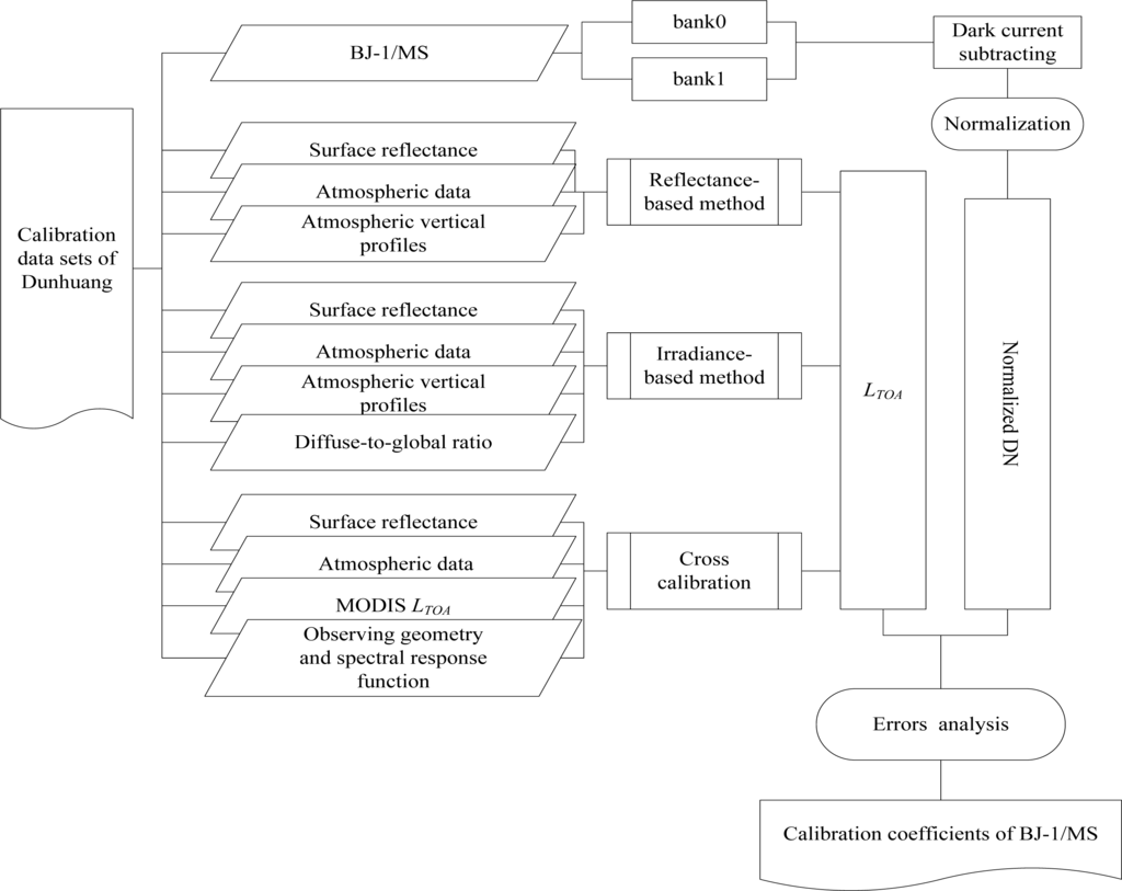 Considering these special factors, an analysis is performed, and the overall workflow is illustrated in Figure 5. Based on images from Beijing-1/MS and MODIS, and the in situ data, three vicarious calibration methods (reflectance-based, irradiance-based, and cross-calibration) were used to calculate the LTOA of Beijing-1/MS. The LTOA data sets were then comprehensively analyzed and suspect results were identified and removed. The final Beijing-1/MS calibration was determined by comparing the results of the three independent calibration methods.