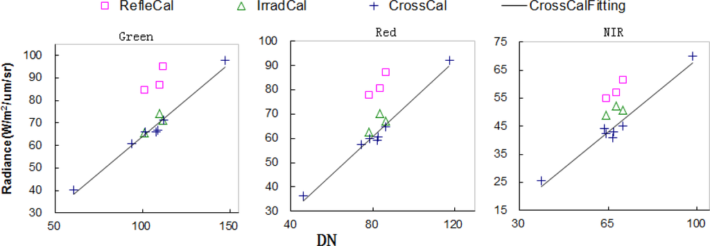 It is interesting to note that: (1) The results of the three vicarious methods are separate whereas the results of one method are gathered; (2) the coefficients derived by the reflectance-based method are obviously larger than those derived from the other two methods; (3) for the irradiance-based method, the coefficients derived on 6 September are larger than those on the other two days; (4) for the reflectance-based and irradiance-based methods, the results on 6 September are more similar than those obtained on the other two days; (5) the linear trends derived from cross-calibration points are sufficiently consistent to provide confidence in the cross-calibration results. The results also indicate that Beijing-1/MS presents a stable radiometric performance within at least two months during a period of three years since the satellite was launched.