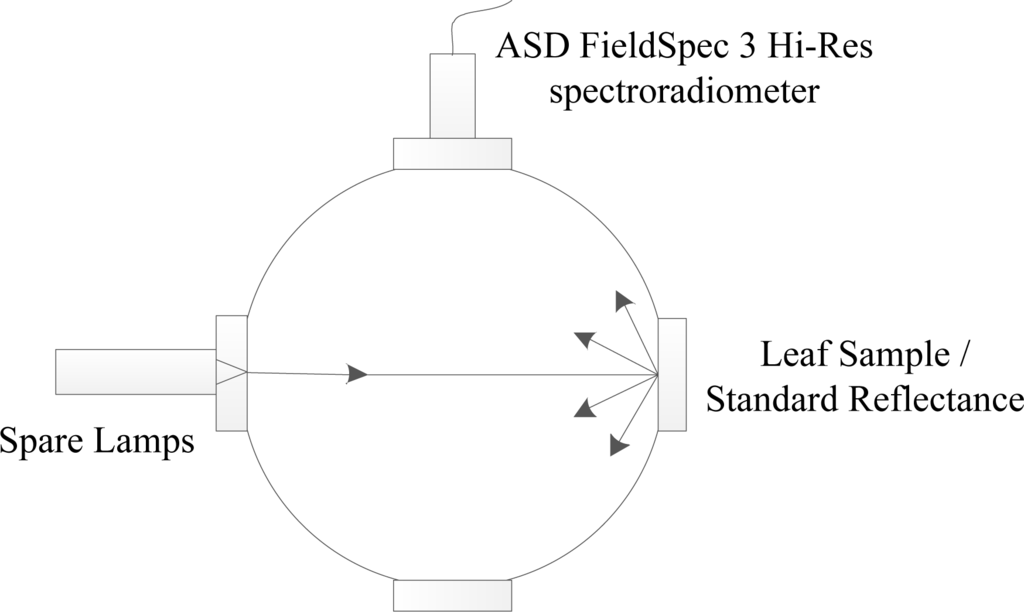 Leaf reflectance measurements were acquired by using an ASD integrating sphere apparatus (as shown in Figure 1) coupled with the ASD FieldSpec 3 Hi-Res spectroradiometer (ASD Inc., Boulder, CO, USA), yielding a 1 nm spectral sampling interval in the visible to near-infrared spectral range (400–2,500 nm). Connected with the integrating sphere, Spare Lamps (Qty 2, Osram #64225, 6 V, 10 W) provided a collimated beam as the light source, which illuminated the sample or the Reference Standard.