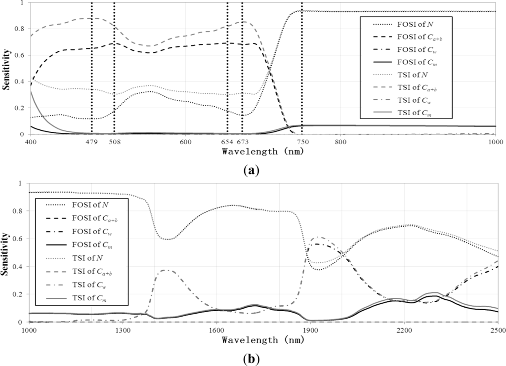 Sensitivity indices of PROSPECT input parameters simulated by EFAST (Extended Fourier Amplitude Sensitivity Test) method. (a) 400–1,000 nm, (b) 1,000–2,500 nm. FOSI: First Order Sensitivity Index, TSI: Total Sensitivity Index. The spectral positions of these selected bands (479, 508, 654, 673, 750 nm) are marked with vertical dotted lines.