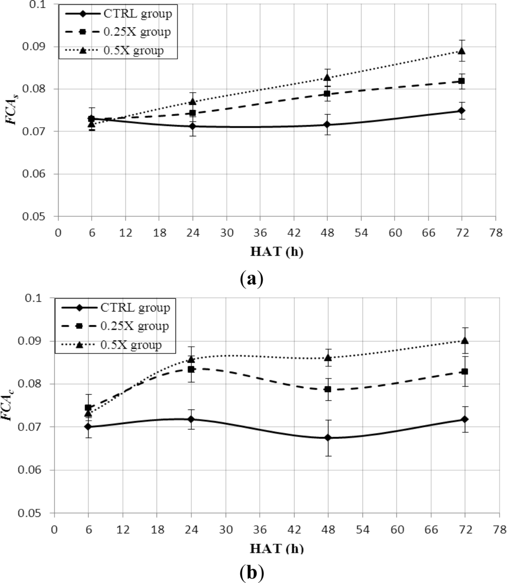 (a) FCAs variation of soybean leaves of the three groups at 6, 24, 48, 72 HAT. (b) FCAc variation of cotton leaves of the three groups at 6, 24, 48, 72 HAT. Each point is a mean value of six leaves for the same treatment. Error bar presents the standard deviation of each point.