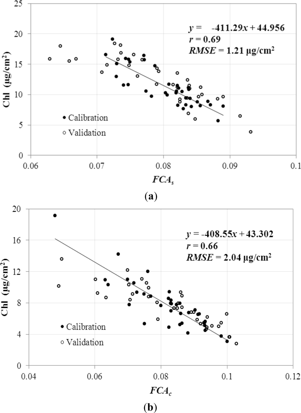 Relationships between FCA and leaf chlorophyll content (Chl): (a) soybean; (b) cotton.