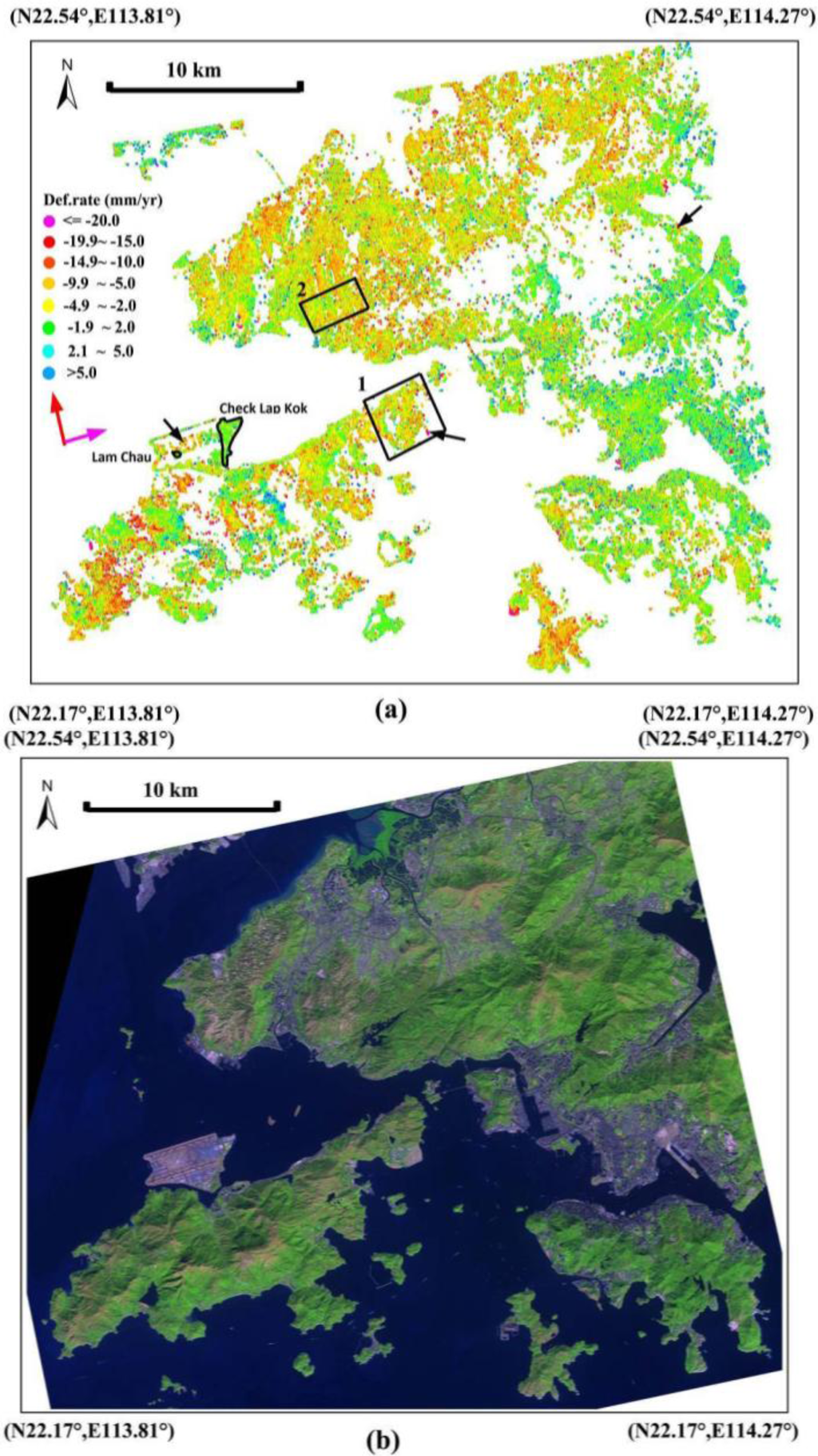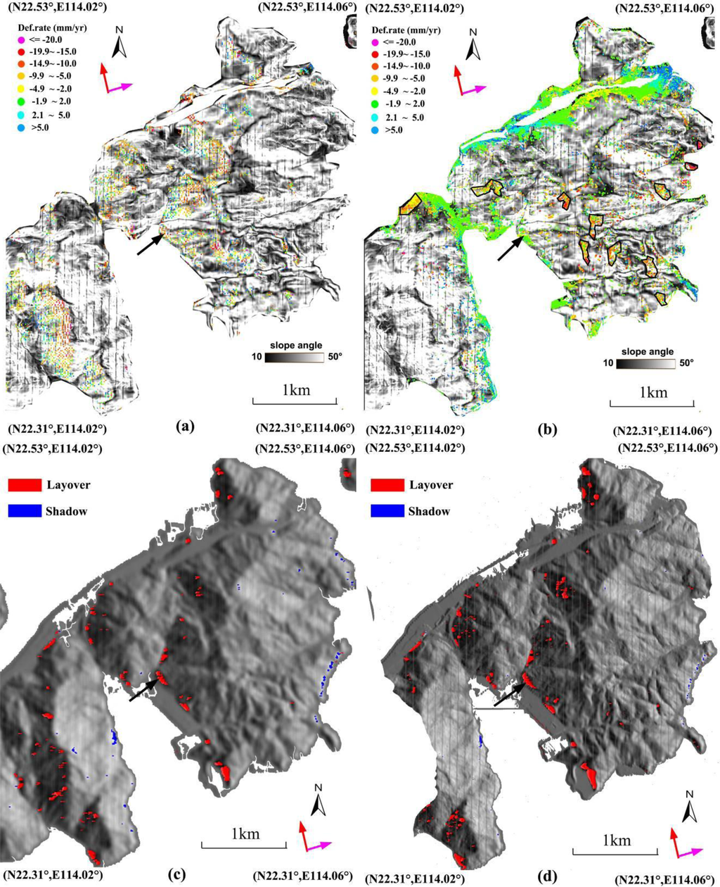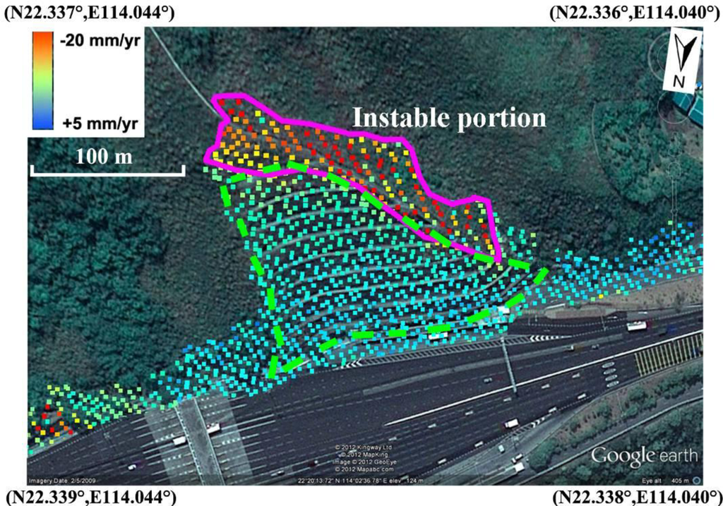 - Rapid urban development in hilly terrain, coupled with tropical rainy storms and weathered covering rocks, has led to the frequent occurrence of disastrous landslides in Hong Kong. Most of those failures are minor and shallow in depth with a volume of usually less than 50 m3 [37] and occurred in vegetated region. Although challenging, the synergistic analysis of L-band PALSAR and X-band TerraSAR provides a feasible solution for taking advantage of high resolution, frequent revisit times as well as long wavelength for the monitoring of superficial displacement of ES and VS slopes. The experimental results imply that SB-InSAR is potential for unstable slope surveillance due to the introduction of 3-D phase unwrapping coupled with the occurrence of DSs in the natural scenario of Hong Kong, e.g., 376 CPs/km2 of L-band PALSAR covering the whole Hong Kong area, 12,656 and 8,487 CPs/km2 of X-band TerraSAR in the Disneyland and Tai Lam sub-regions, respectively.