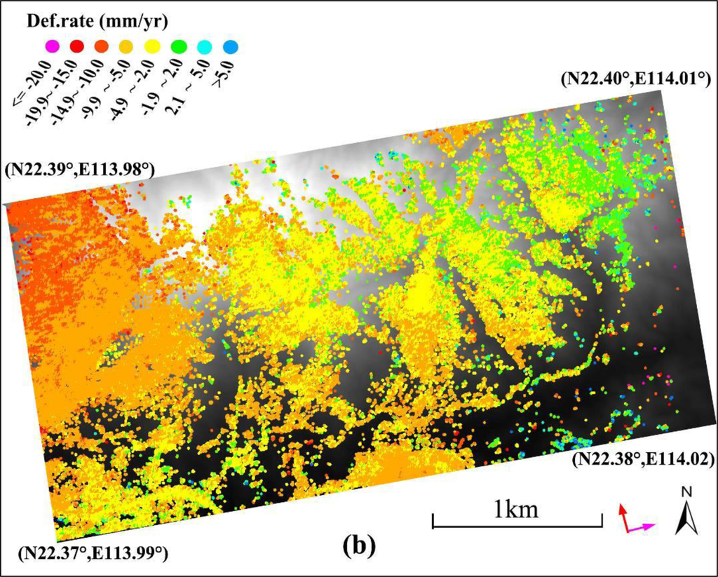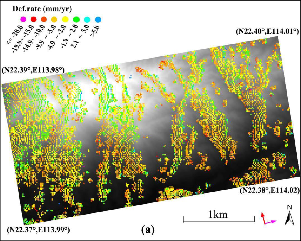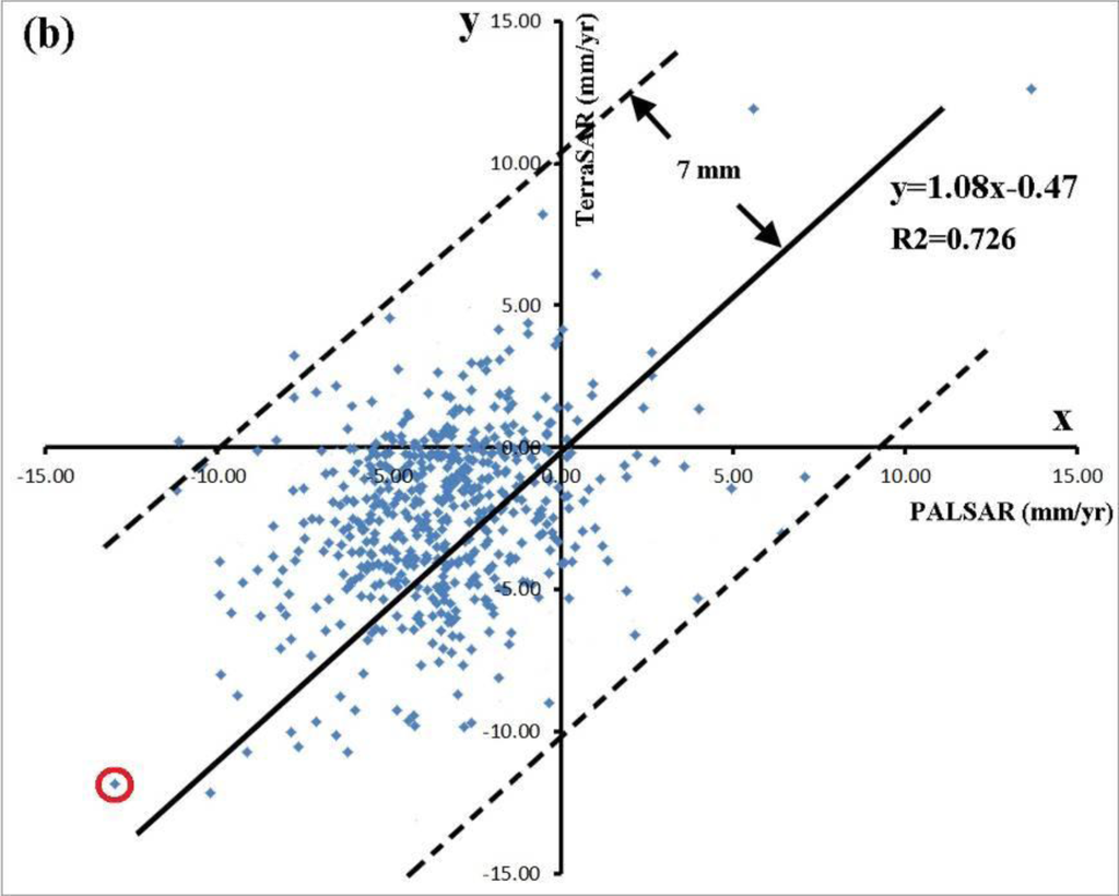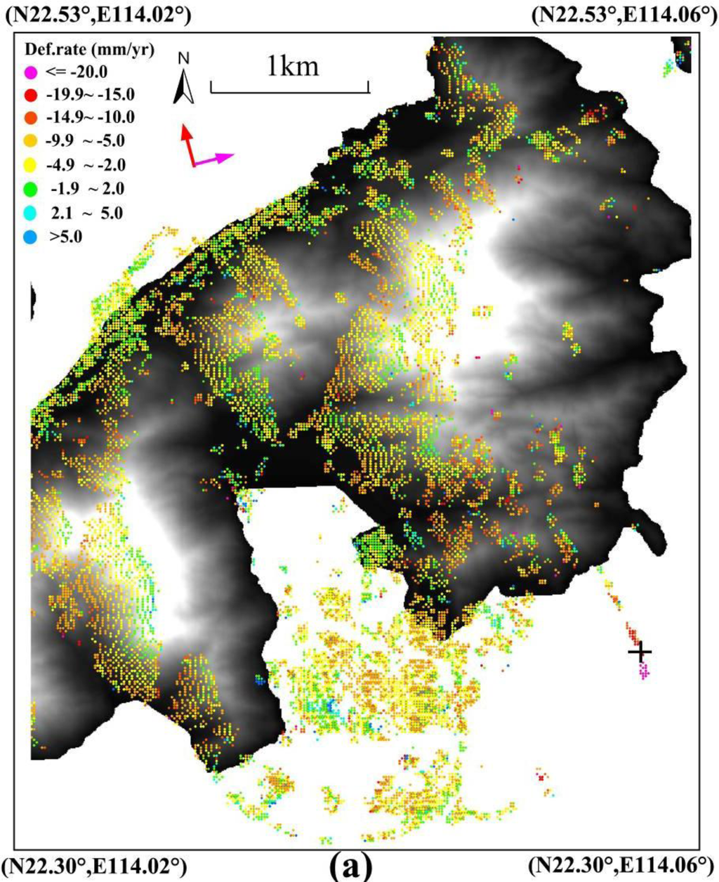 - Rapid urban development in hilly terrain, coupled with tropical rainy storms and weathered covering rocks, has led to the frequent occurrence of disastrous landslides in Hong Kong. Most of those failures are minor and shallow in depth with a volume of usually less than 50 m3 [37] and occurred in vegetated region. Although challenging, the synergistic analysis of L-band PALSAR and X-band TerraSAR provides a feasible solution for taking advantage of high resolution, frequent revisit times as well as long wavelength for the monitoring of superficial displacement of ES and VS slopes. The experimental results imply that SB-InSAR is potential for unstable slope surveillance due to the introduction of 3-D phase unwrapping coupled with the occurrence of DSs in the natural scenario of Hong Kong, e.g., 376 CPs/km2 of L-band PALSAR covering the whole Hong Kong area, 12,656 and 8,487 CPs/km2 of X-band TerraSAR in the Disneyland and Tai Lam sub-regions, respectively.