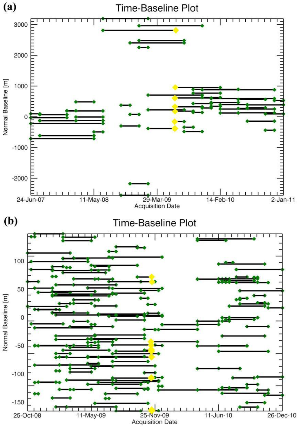- The generation of M multi-looked, filtered small baseline differential interferograms (after the flat and topographic phase removal). For the ALOS PALSAR data, two thresholds for baselines (smaller than 3,000 m spatially and 368 days temporally) were first applied to generate initial interferograms; then interferograms with perpendicular baselines larger than 1,500 m were kept only if they were needed to guarantee connectivity of the subsets in time. A total of 57 final interferograms (Figure 2a) were generated. For the TerraSAR-X data, a small baseline constraint (less than 150 m spatially and 180 days temporally) was applied to generate 226 initial interferograms; of these 45 low-quality inteferograms were discarded and the remaining 181 were retained (Figure 2b). Therefore, problems of temporal and geometric decorrelation and residual phase due to uncompensated topography were mitigated. Such a baseline constraint leads to several independent interferogram subsets, and thus SB-InSAR is also termed within the scientific community as small baseline subsets (SBAS).