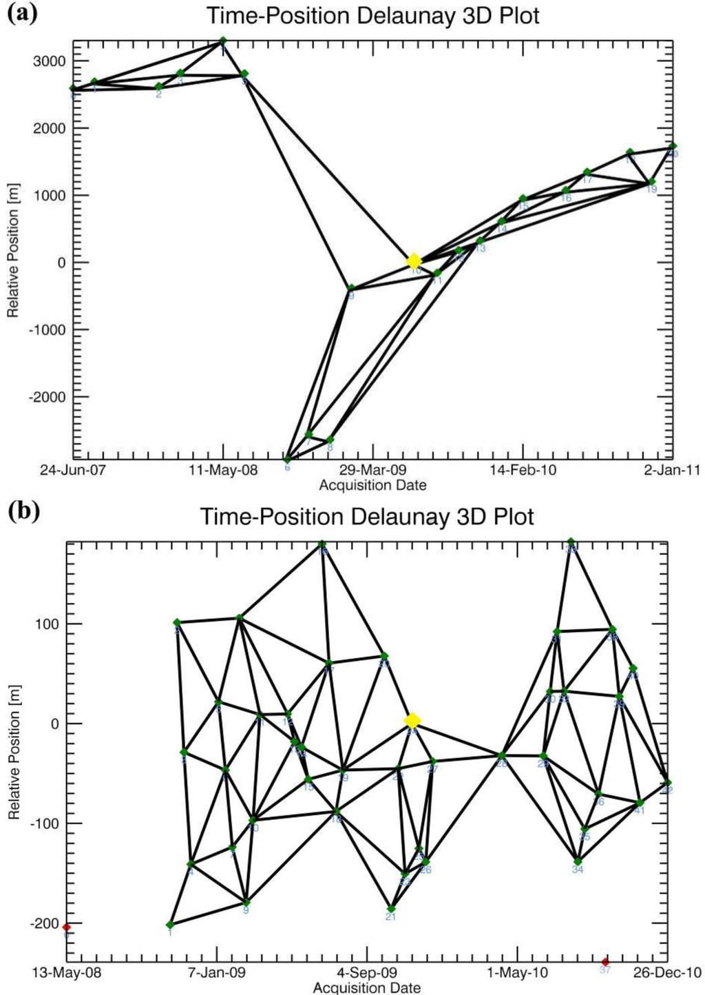 - Absolute phase estimation by means of interferogram unwrapping. Phase unwrapping is a crucial step for the successful implementation of SB-InSAR. In general, the 2-D spatial phase unwrapping is a traditional way, whether for an entire interferogram or for sparse point-targets on an interferogram [40]. Recent advances have focused on algorithms that incorporate both the temporal and spatial dimensions, so-called 3-D phase unwrapping [41–43]. Considering the redundant network of interferograms in time, the Delauney-based 3-D phase unwrapping method [44] was applied; phase unwrapping in the spatial domain was constrained through the consistency of the network in time (see Figure 3). Note that two original TerraSAR images acquired in 13 May 2008 and 18 September 2010 were discarded during interferogram formation because of the applied spatial baseline constraint of 150 m.