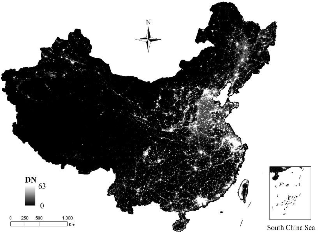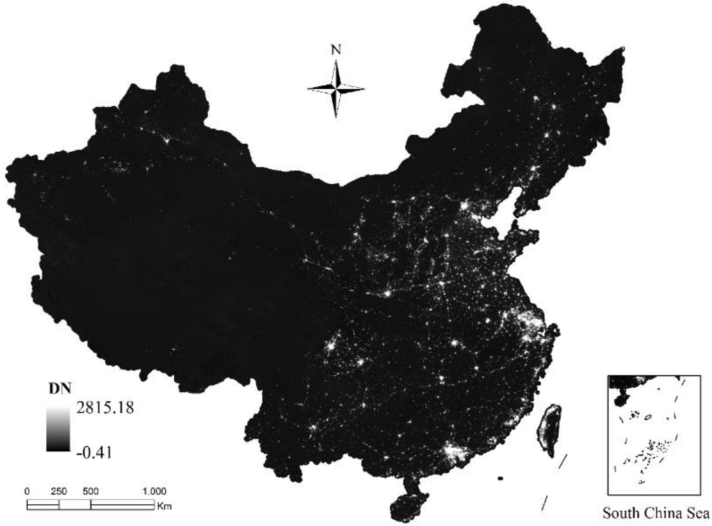 The boundary data of administrative divisions of mainland China, including national, provincial, and prefectural boundaries, were obtained from the National Geomatics Center of China. The nighttime light images of China were extracted from the global datasets of NPP-VIIRS data (Figure 1) and DMSP-OLS data (Figure 2) by using a mask polygon of the national boundary of China with a 50 km buffer. All the data were projected into the Lambert Azimuthal Equal Area Projection and resampled to the spatial resolution of 500 m × 500 m (cell size).