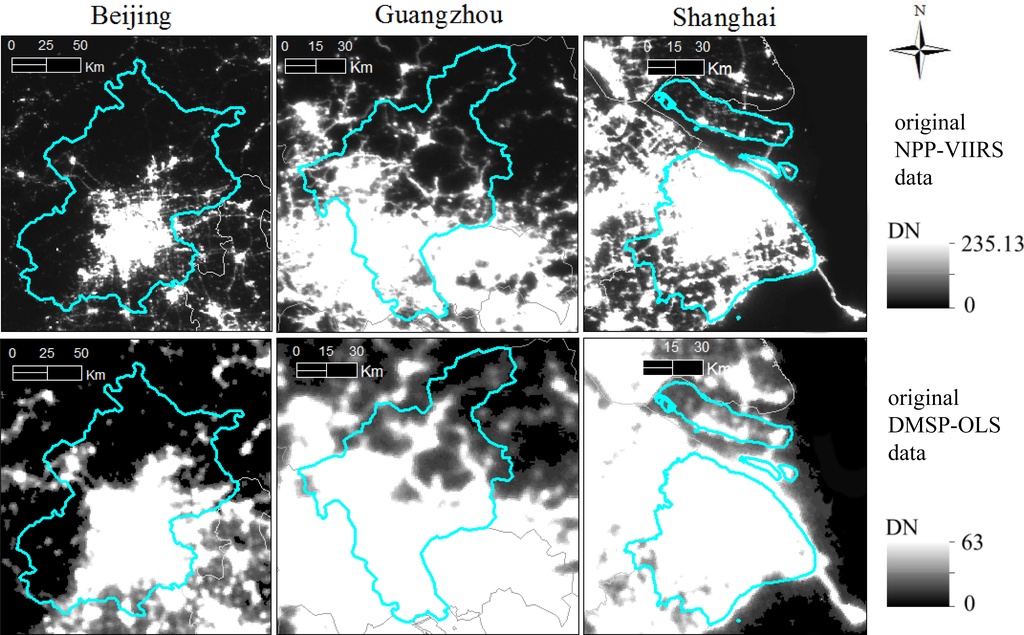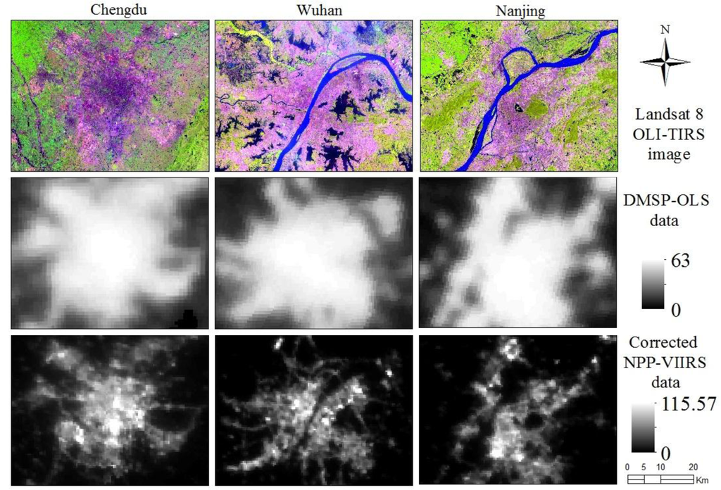 Comparison among the DMSP-OLS data, corrected NPP-VIIRS data, and Landsat 8 OLI-TIRS images for three cities in China.