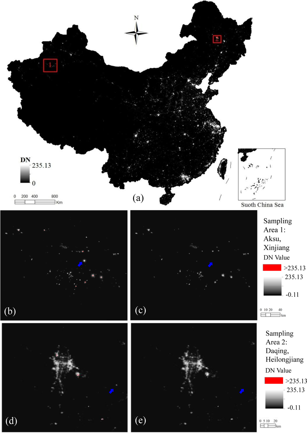 (a) The corrected NPP-VIIRS nighttime light data of China in 2012. Two regions bounded by red rectangles are Aksu, Xinjiang (sampling area No. 1) and Daqing, Heilongjiang (sampling area NO.2). The (b) original and (c) corrected image of sampling area NO.1; and the (d) original and (e) corrected image of sampling area No. 2. Two typical removed lit areas are pointed by blue arrows.