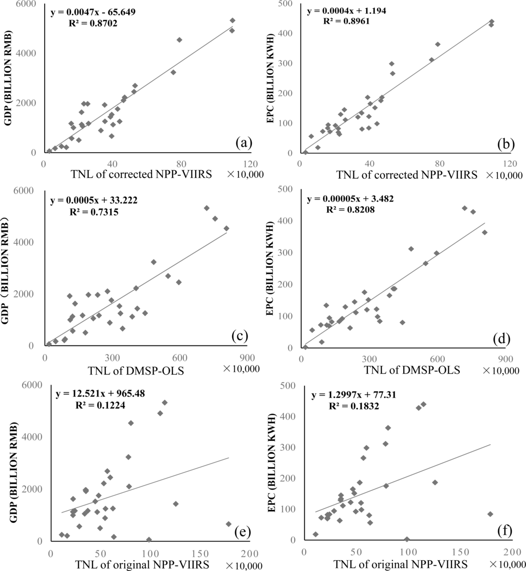 The scatter diagram of linear regression analysis in provincial units: (a) the total nighttime light (TNL) of corrected NPP-VIIRS data and the gross domestic product (GDP); (b) the TNL of corrected NPP-VIIRS data and the electric power consumption (EPC); (c) the TNL of DMSP-OLS data and the GDP; (d) the TNL of DMSP-OLS data and the EPC; (e) the TNL of original NPP-VIIRS data and the GDP; (f) the TNL of original NPP-VIIRS data and the EPC.
