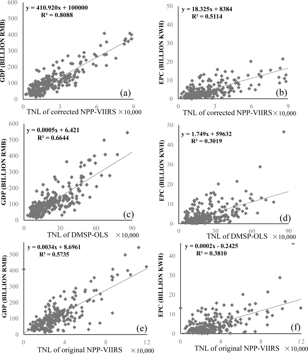 Linear regressions had also been applied to all 268 selected prefectural-level units of mainland China to evaluate the TNL-GDP relationship and the TNL-EPC relationship, as shown in Figure 6. At the prefectural level, the R2 value of the TNL from corrected NPP-VIIRS data and GDP was 0.8088 (Figure 6a), whereas that of the TNL from DMSP-OLS data and GDP was 0.6644 (Figure 6c). In addition, the R2 value of the TNL from original NPP-VIIRS and GDP was 0.5735 (Figure 6e). The R2 value of the TNL from corrected NPP-VIIRS data with EPC was 0.5114 (Figure 6b), which was higher than that value from DMSP-OLS data with EPC (0.3019, see Figure 6d) and that value from the original NPP-VIIRS and EPC (0.3810, see Figure 6f). Although the R2 values were relatively low, they all passed the F-test at the 0.001 level.