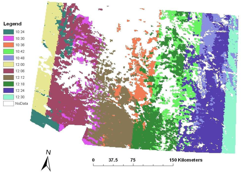 The version 5 MOD11A1 reprocessing data contain single observations in each grid cell, rather than averaged swath observations (averaged observations were contained in earlier reprocessing versions) where multiple inputs to grid cells from overlapping swaths occur. MODIS LST (MOD11A1) tile data can contain non-sequential and temporally disparate surface temperature data. Spatial subsets matching the study area were extracted from the 2008 MOD11A1 tile data. MOD11A1 LST and the coincident local solar View Time (VT) were reprojected from sinusoidal projection to 1 km gridded geotiff Albers Equal Area Projection, (WGS84) using nearest neighbour resampling [33]. View time is extracted because surface temperature (and thus LST) is critically dependent on solar azimuth, and thus the time of day. These LST product layers were converted to local solar time and temperature using the conversion factors provided at http://lpdaac.usgs.gov/modis. The conversion of spatial subsets of the MODIS native local solar VT to local standard time requires longitude information for each grid cell. To facilitate conversion of view time from local solar time to local time the view time layers were subdivided into 1° longitude bands, across which uniform time conversion was assigned. This procedure introduces error in local time, which is at a maximum of 2 min at whole number lines of longitude and decreases to zero at the half way line between whole number lines. Since the local solar time to local time conversion is dependent upon the day of year, a new conversion is required for each day of the year. Thus a different time conversion is applied to each daily one degree of longitude subset.
