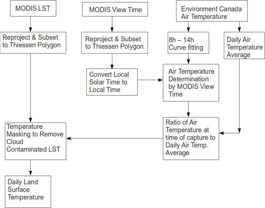 Step 3: The daily unitless values created in Step 2 were multiplied by the corresponding MODIS LST grid value to produce the ICM, which retained the same spatial resolution as the input MODIS LST data. MODIS LST over the study area was collected during the overpass time, not specifically on the hour as the Environment Canada station air temperature was. Therefore, to fully exploit the MODIS LST data, the curves in step one are required.