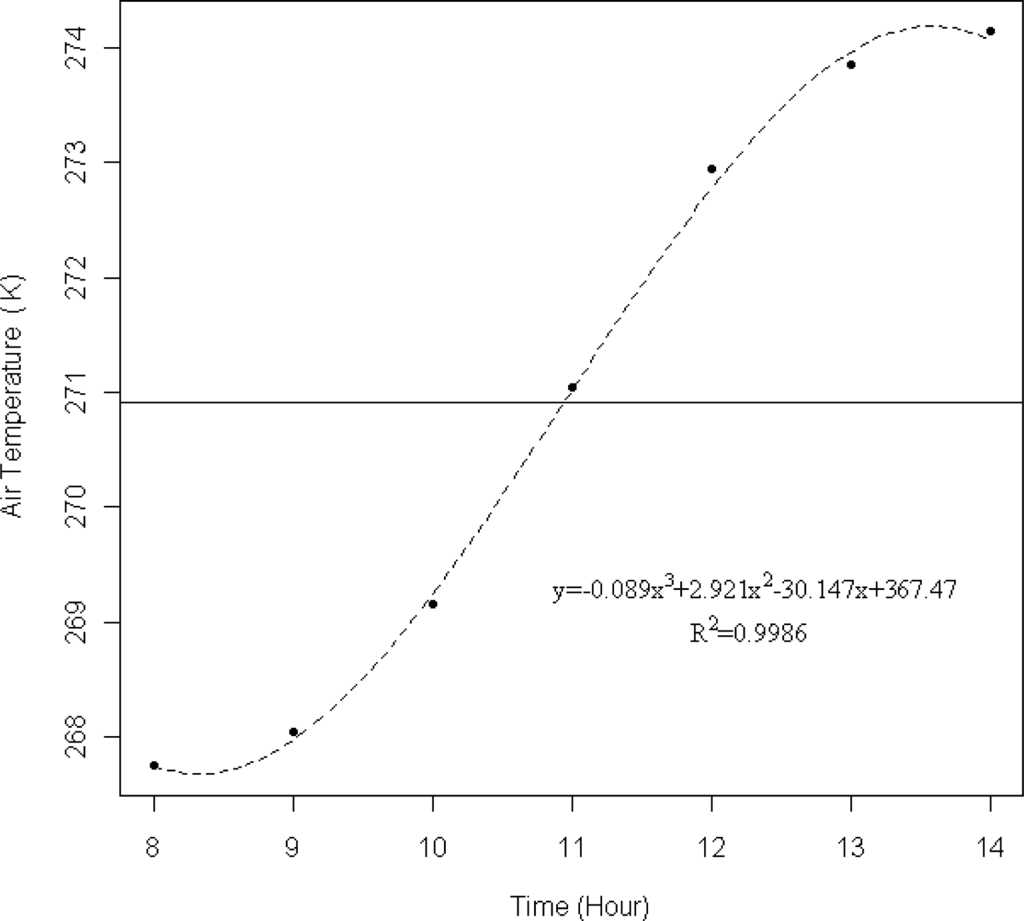 Air temperature between 8 AM and 2 PM at Whitehorse on 20 October 2008. The dashed line indicates the polynomial trend line and the solid line (270.9 K) indicates the average air temperature between 12:01 AM and 11:59 PM on 20 October 2008. Hour on the x axis indicates time in hours.