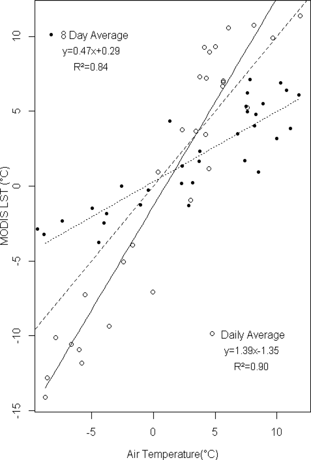 Daily mean Land Surface Temperature computed from maximum and minimum daily LST (MMM) compared to daily average air temperature calculated from hourly means at seven stations in the southwest Yukon (open circles and the solid line is the linear trend). The 8-day LST was computed from maximum and minimum daily values (closed circles, and the dotted line is the linear trend). The dashed line indicates the 1:1 line.