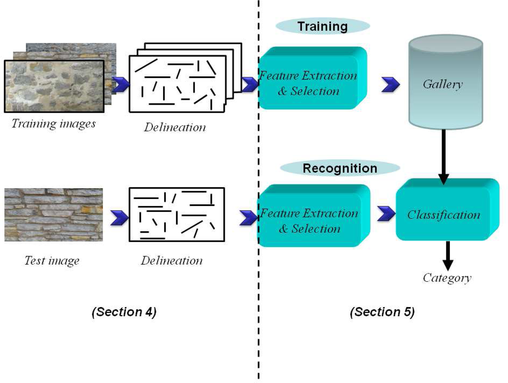 Our proposed framework for the automatic delineation and classification of built heritage has two phases. In the first phase, the test image undergoes a series of processing steps in order to extract a set of straight line segments from which a statistical signature is inferred. This set of straight line segments constitutes a partial delineation of blocks. In the second phase, the statistical signature is filtered out and classified using classifiers. The proposed framework is outlined in Figure 1.