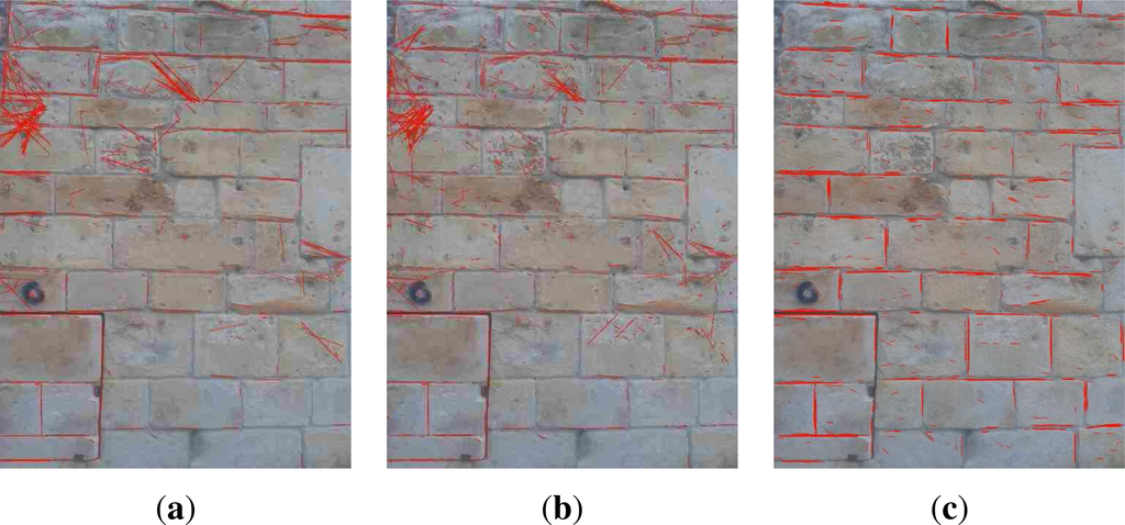 Once we get the binary boundaries, we apply a closing operation on them. The probabilistic Hough transform (PHT) (as an implementation of this algorithm, we use the CV_HOUGH_PROBABILISTIC method of the cvHoughLines2 function in OpenCV 2.3.1 [45]) is then used in order to extract the 2D straight line segments. The result of this process for the example ROI can be seen in Figure 8e. In this figure, we can observe that the line segments are close to each other in some parts of the delineation. This redundancy is due to the use of three segmented images that may have region boundaries close to each other. We stress the fact that this redundancy can be beneficial for describing the local geometry of the masonry and, thus, offering discriminative information that will be explained in the next section.