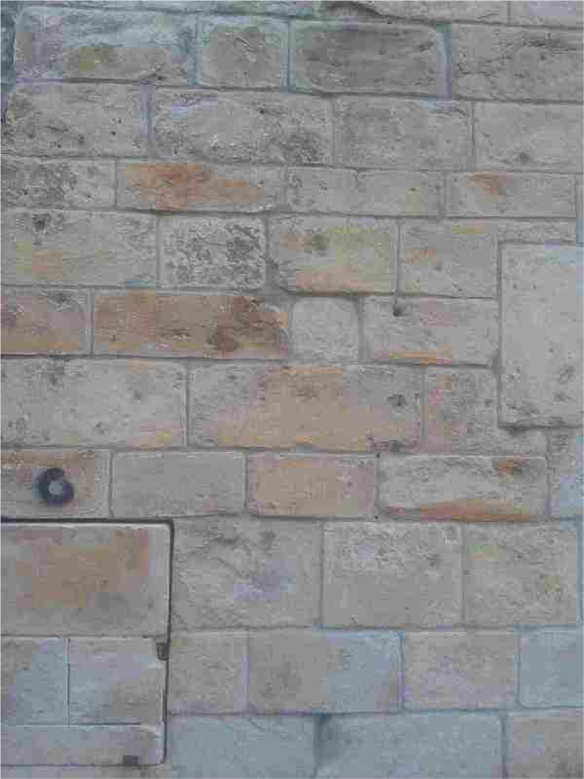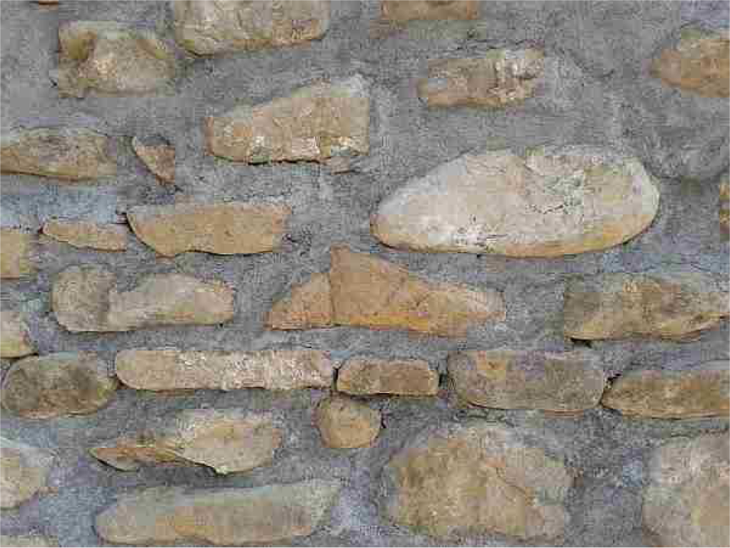 The built heritage that will be assessed using Fundación Zain’s protection protocols consists of stone masonry construction. Our objective is to develop image-based tools that help automate the application of these protocols. In this paper, we address the image-based extraction of the masonry arrangement for automatic classification. The fully automatic, image-based delineation of individual stones of built heritage can be very challenging, due to the characteristics of the objects to be delineated and the environment in which they are. Stone masonry walls of built heritage are built with many types of stones and mortar. Often, the same wall contains stones of different colors, sizes, shapes and materials. This can be appreciated looking at the various walls shown in the different figures in this paper. These walls belong to construction that is old and outdoors, thus having suffered from prolonged weathering, leading to different degradation patterns, such as discoloration and biological colonization [25]. Therefore, unlike crisp (i.e., precisely delimited) and structured regions that are usually present in modern building scenes, the blocks in the walls under consideration do not have structured and crisp boundaries. Biological colonization, i.e., vegetation growing in the wall, results in occlusions. As a consequence, the physical boundaries that delineate individual stones, when imaged, do not always offer meaningful information about the real boundaries of the stones. These degradation patterns will, often, have a negative impact on the performance of the delineation algorithms.