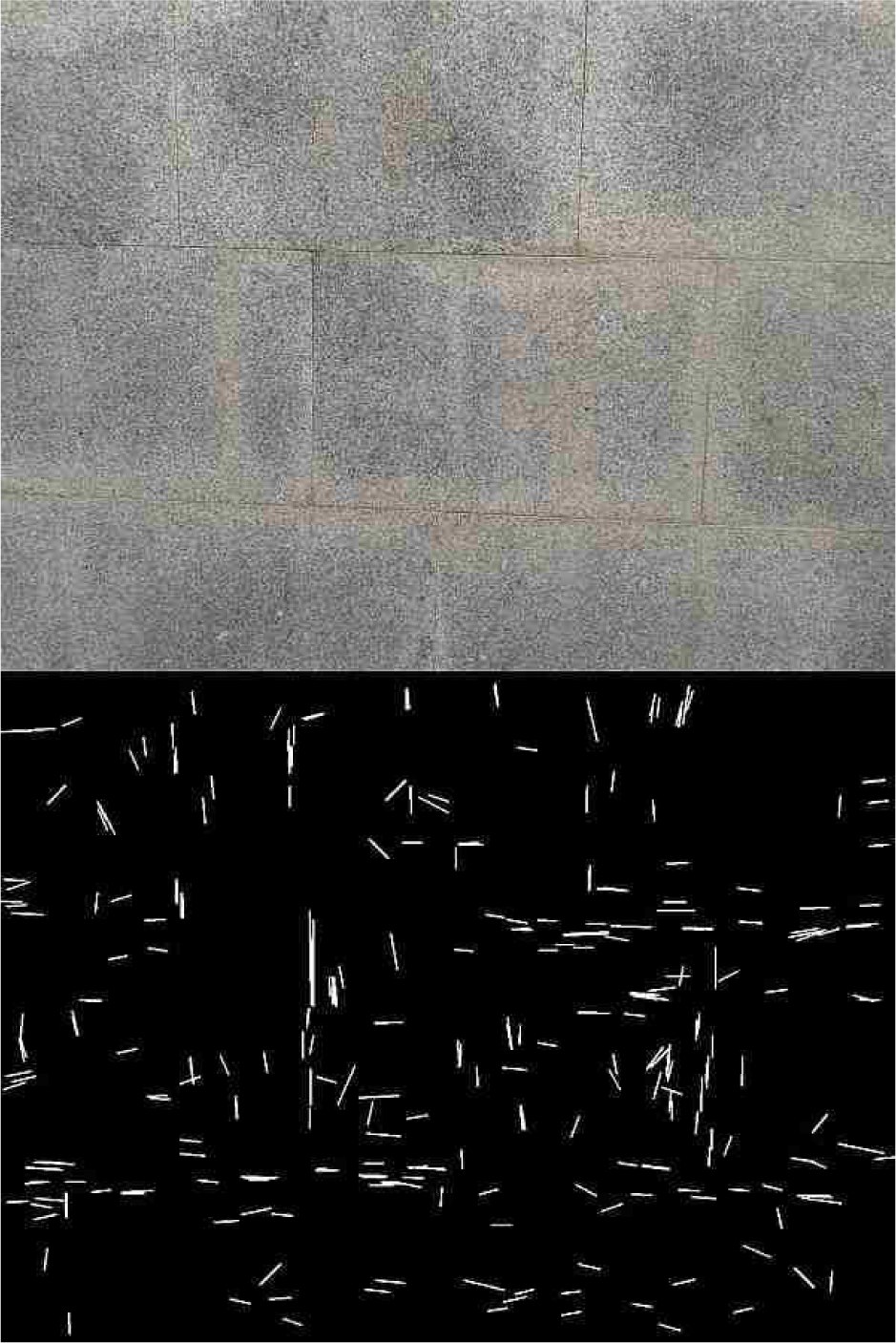 The final delineation is the set of all the segments detected in all three binary images and in all ROIs. The post-processing of the delineation consists in joining collinear segments that are close to each other and removing small segments. Collinear segments are those for which the difference between their polar coordinates is below some predefined threshold. Two segments that have been classified as collinear are joined together if the distance between their closest end points is below some predefined threshold. Joining two segments together means that those two segments are replaced by a new straight segment delimited by the two furthest end points. Lastly, segments whose length is below the mean length have been removed from the set, because their slope is not very reliable, and they are often noisy. We point out that this post-processing step is very useful for overcoming the fragmentation of the detected segments due to the ROI partition of the full image.