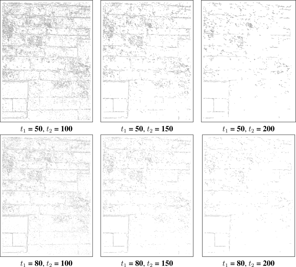 Figure 3. Images showing the result of applying the Canny edge detector to the original image with an aperture size of three and different threshold values. t1 denotes the lower threshold and t2 the upper threshold.