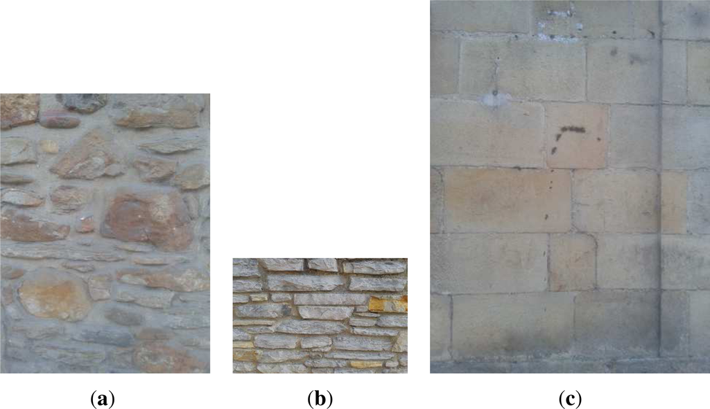 Three classes of masonry arrangements have been defined in these protocols: the first class are blocks (usually irregular) not arranged in rows (Figure 4a); the second are irregular blocks arranged in rows (Figure 4b); and, third, regular (rectangular) blocks arranged in rows (Figure 4c). The masonry walls used in this experiment are located at different sites in the Basque Country: Durango and Urdaibai. The dataset contains 86 wall images; 33 belong to Class 1, 15 belong to Class 2 and the remaining 38 to Class 3.
