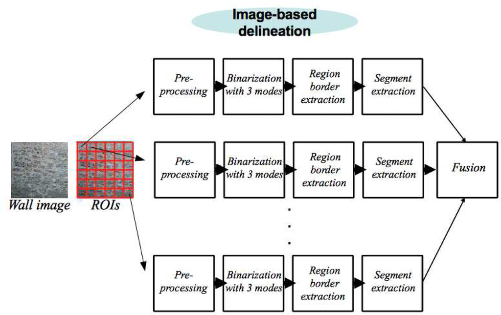 The objective is to use straight segments to delineate the masonry. We have chosen to extract straight segments, because this allows us to obtain additional information, such as slope (the steepness of a straight line), length and position of the segment. The statistics of these geometric properties will be very valuable for subsequent classification tasks. In our framework, the straight 2D segments are not derived from the image gradients, but from the boundaries of some detected regions in the preprocessed images, as explained next.