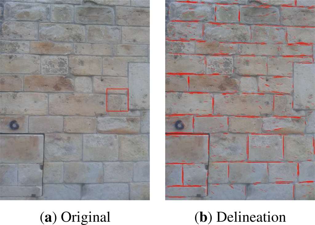 Within the field of built heritage documentation, automatic delineation is being researched using either optical images [36] or 3D point clouds obtained with terrestrial laser scanners [37,38]. Bienert [39] proposes a method for automatic vectorization based on extracting the contours of the profiles of a building. Briese and Pfeifer [37] have developed algorithms for the automatic extraction of lines that delimit elements in a 3D point cloud, but it still requires manual input. Boulaassal et al. [38] combine 3D point clouds obtained with different laser scanners (terrestrial, airborne and vehicle-based) and transform this into a model composed of geometric shapes that represents the building. Nevertheless, none of these methods obtain the delineation, or tracing, we are looking for. Sithole [40], on the other hand, has developed a method to detect bricks in a wall through segmentation of the 3D point cloud. However, his method requires that the mortar joining the bricks is at a significantly different depth from that of the bricks (i.e., the bricks’s surfaces and mortar must be in different planes) and that there is sufficient separation between bricks. These assumptions do not hold in many of the stone masonry cases we are analyzing, and thus, this method is irrelevant to us. Demarsin [41] developed a method to extract straight lines delimiting different elements of industrial parts for his thesis. However, he points out that the application of this method to a 3D point cloud of an architectural element would not be appropriate, due to the differences between the point clouds (like the size and the presence of merely ornamental elements). Hammoudi [42] extracts polygon models for façades from 3D point clouds and cadastral maps.