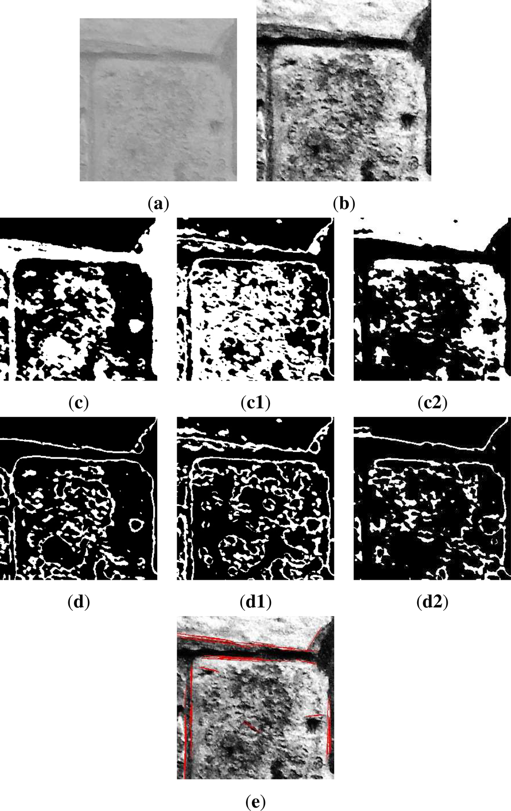Figure 8. The main stages of processing the example ROI in Figure 7a. (a) Grayscale; (b) preprocessed; (c) region segmentation using three modes; (d) corresponding boundaries; (e) combined, extracted straight segments. (a) ROI; (b) pre-processed ROI; (c) segmentation for intensity of zero; (c1) first mode segmentation; (c2) second mode segmentation; (d) first boundaries map; (d1) second boundaries map; (d2) third boundaries map; (e) extracted 2D segments associated with the three maps in (d).