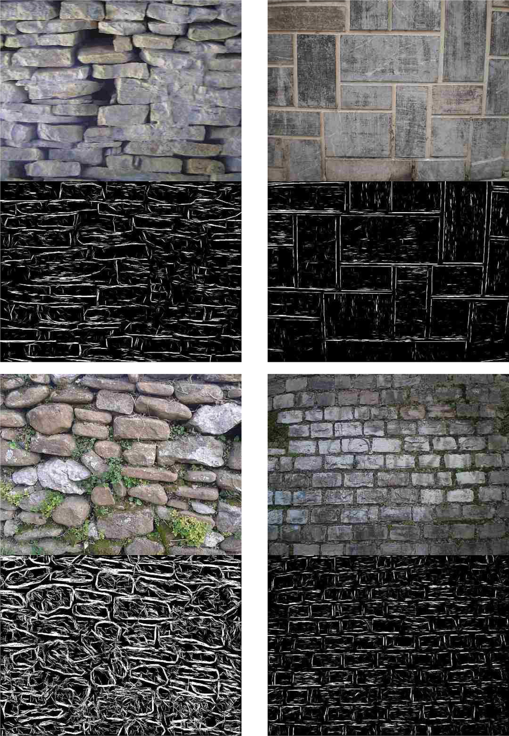 Figure 7b illustrates the final delineation of the masonry (a set of 2D segments shown in red) associated with the image. Figure 9 illustrates the obtained delineation associated with four, very different walls. The two walls on the right show the regular arrangement of regular blocks, whereas the two on the left show irregular blocks, arranged in rows in the top wall and semi-irregularly in the bottom wall. The top-left wall shows a case in which some sort of mortar has been applied on the center-right area of the wall, partly occluding the boundaries between the stones. The bottom-left wall shows a case in which vegetation is partly occluding the wall.