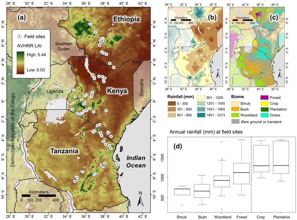 Distribution of 274 field sites in relation to the Global Inventory Modeling and Mapping Studies (GIMMS) LAI3g product, rainfall and major biome types in East Africa. (a) Distribution of field sites located in shrub, bush, woodland, forest, crops and plantations overlaid on Earth Observation (EO) derived LAIavhrr map (for details see Text). (b) Rainfall environment in East Africa derived from WORLDCLIM (1 km pixel resolution). (c) Distribution of biome pixels with no change in biome between 2007 and 2011. (d) Rainfall environment of field sites.