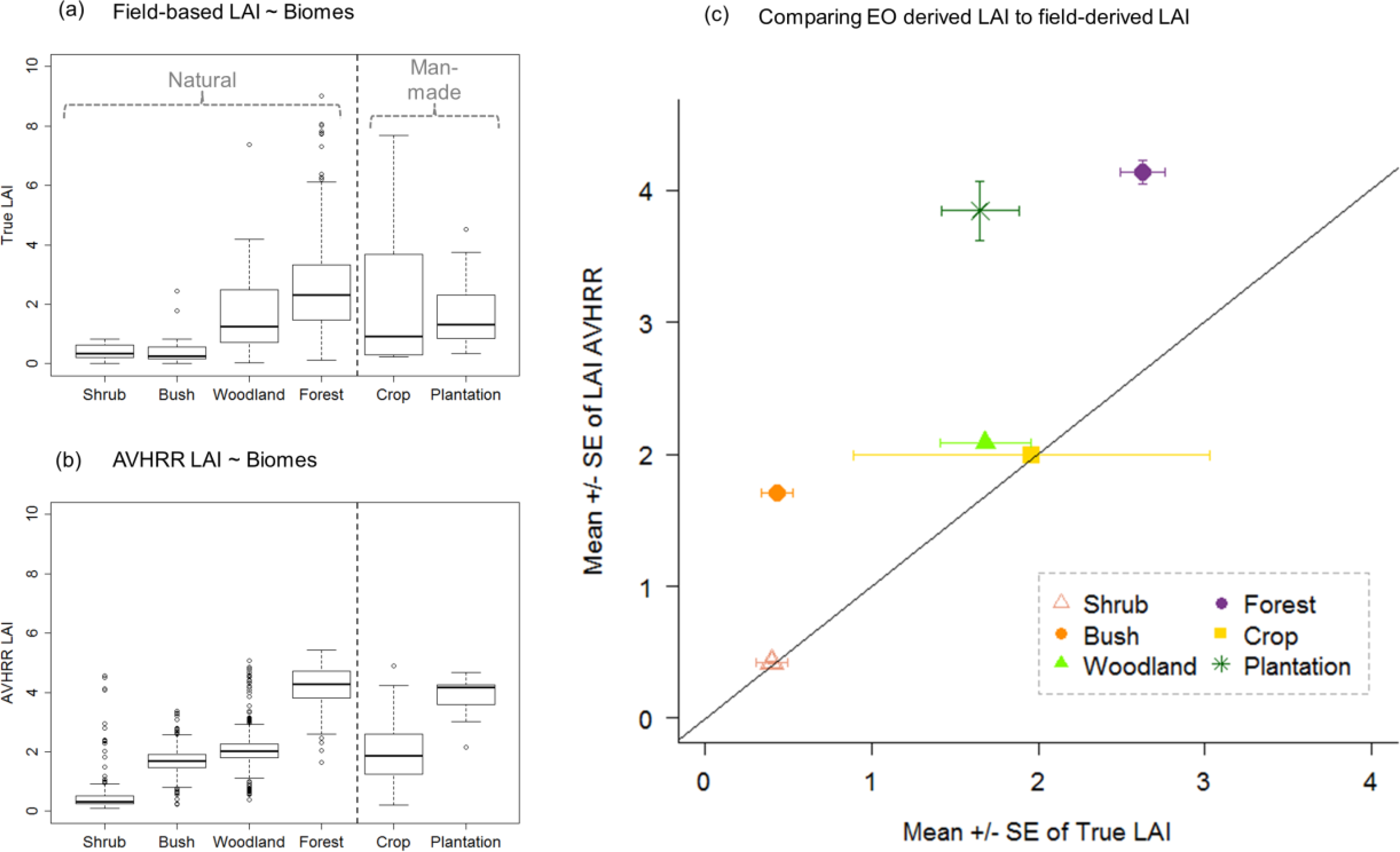 Estimates of field-derived LAI (LAITrue) and earth observation-derived LAI (LAIavhrr) for natural and man-made biomes in East Africa. (a) LAITrue estimates derived for 274 study sites. (b) LAIavhrr estimates derived for randomly created plots using MODIS biome maps. (c) Comparison between LAIavhrr and LAITrue (1:1 line indicates complete agreement).