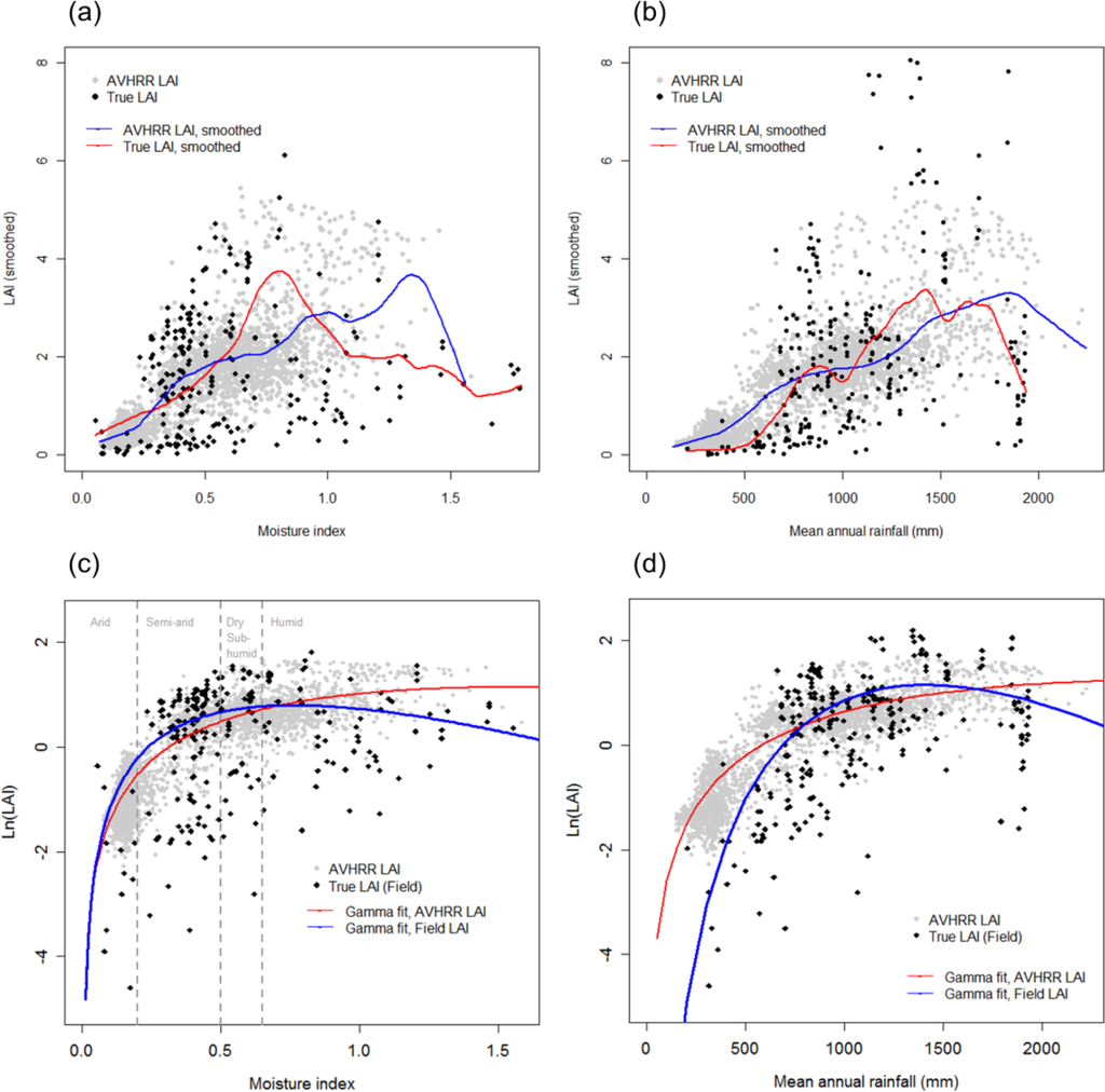 In tropical Africa, vegetation phenology is particularly tuned to precipitation and its seasonal shifts [45,46], which may be impacted by rising global temperatures [47]. Rainfall triggers the emergence of green leaves in deciduous biomes, and controls vegetative growth and growth-duration in semi-arid and arid environments [48]. Vegetation indices such as NDVI, as a surrogate of vegetation productivity and phenology, have been linked to rainfall and rainfall and rainfall variability [49] in East Africa via a log-linear relationship. Nonlinear responses of LAI to PPT (and derived MI) in our study area are captured by both LAIavhrr and LAITrue by the same functional relationship. LAI increases with water availability up to a maximum, declining at higher values of annual rainfall and moisture. However, the response curves differ significantly, in that field-derived LAI reaches its maximum at lower values of the respective environmental driver, and exhibits a more rapid rate of change.