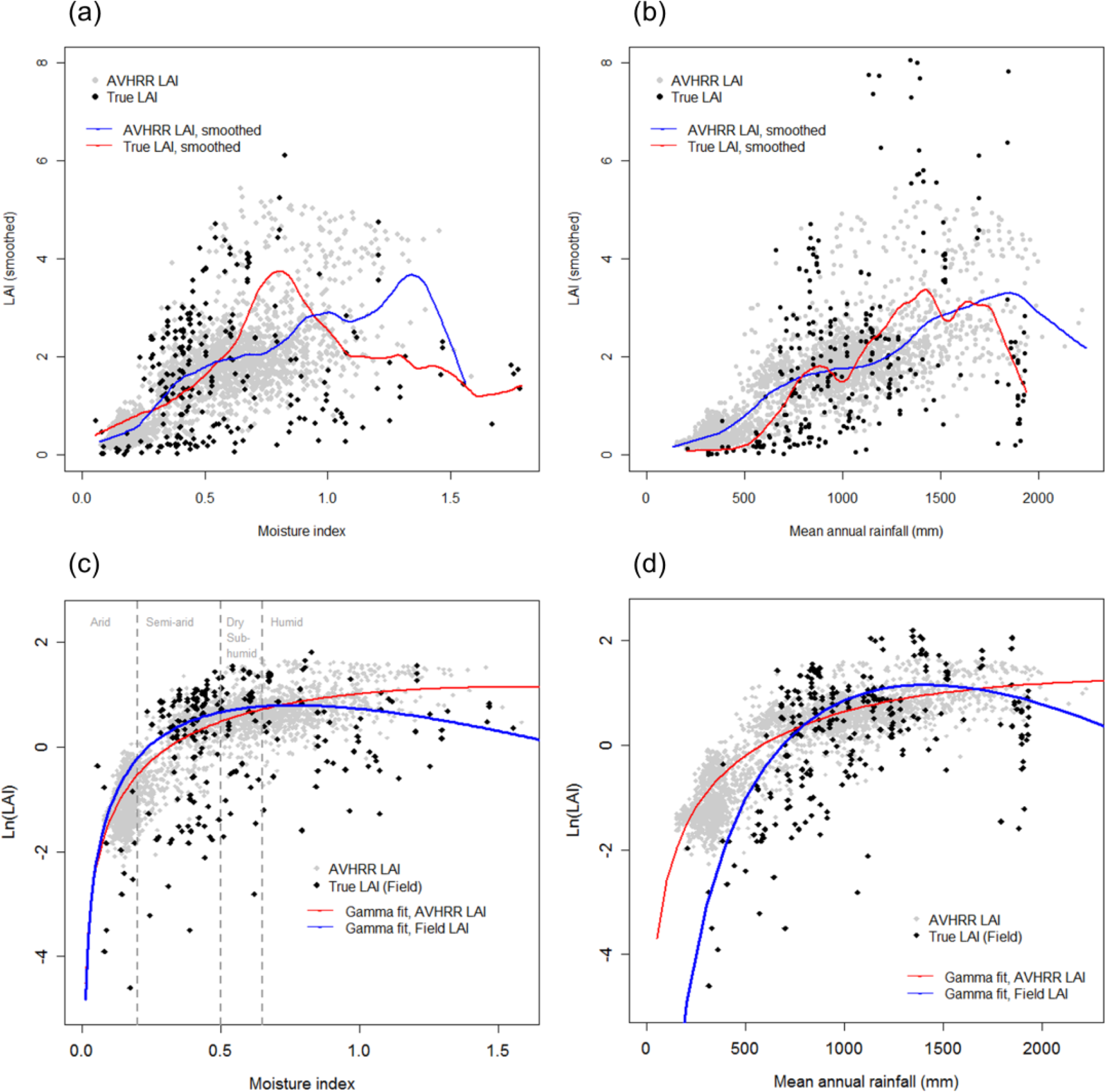 Smoothed response curves of LAITrue and LAIavhrr versus PPT and MI were similar, showing an increase of LAI to global maxima, followed by a decrease at higher values of the environmental driver (Figure 3). Adhering to an a priori functional form, responses of LAITrue and LAIavhrr to PPT and MI were better captured by gamma distributions (Residual Standard Error, LAITrue: RSSPPT = 1.574, RSSMI = 0.584; LAIavhrr: RSSMI = 0.584, RSSPPT = 0.567) as opposed to logistic functions (LAITrue: RSSPPT = 1.609, RSSMI =1.18; LAIavhrr: did not converge) or linear models (LAITrue: RSSPPT = 1.676, RSSMI = 1.238; LAIavhrr: RSSMI = 0.600 and RSSPPT = 0.573).