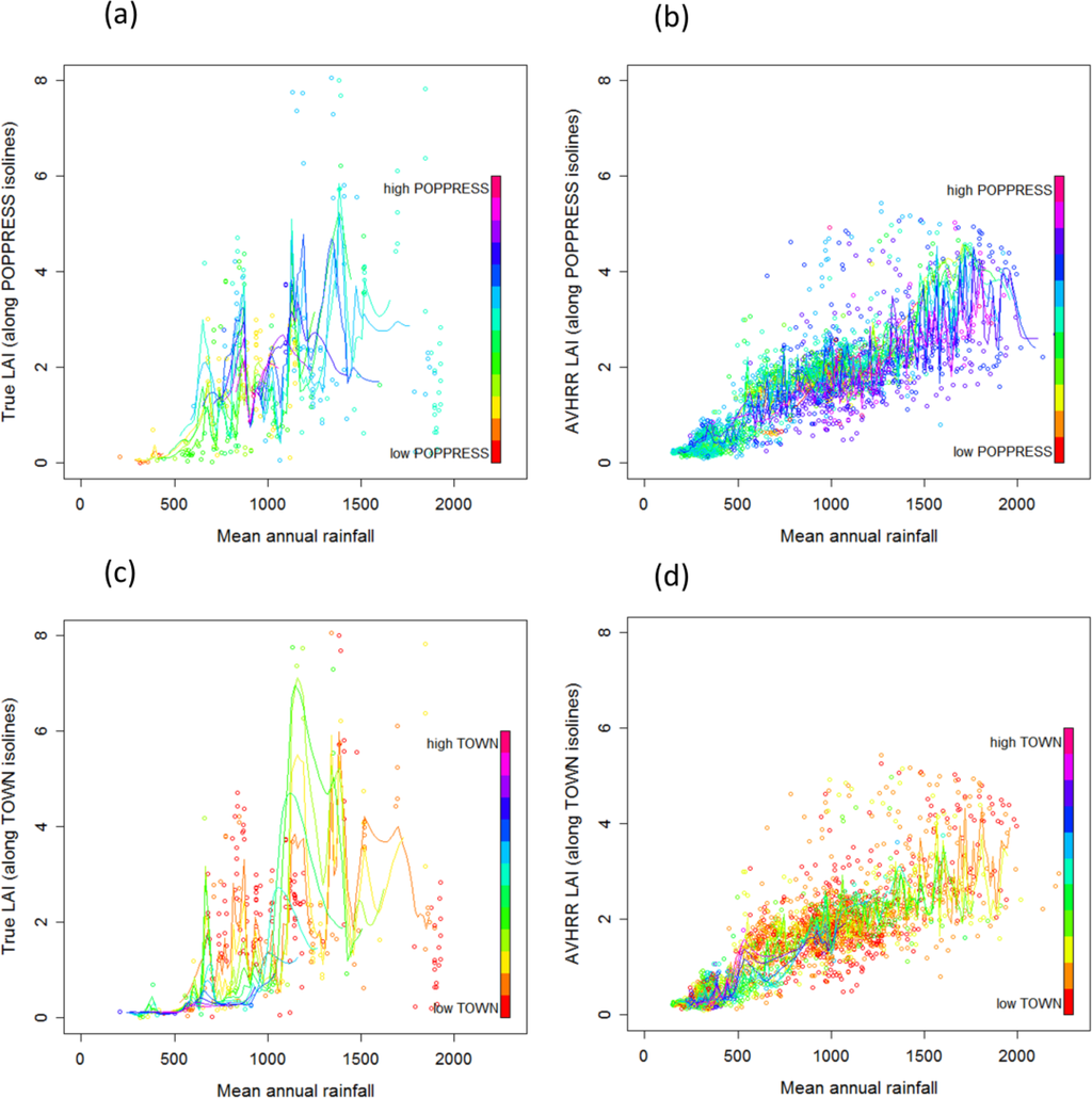 This creates an interpolant that fits a surface of the form LAI = f (PPT, POPPRESS) which passes through the sample values at the point locations. We interpolated LAI on a regular grid of PPT × POPPRESS, which enabled us to look at variations of LAI with one variable whilst fixing the other one. Flat slopes in the rainfall isolines suggested that LAI given POPPRESS and PPT is indeed nearly the same as LAI given PPT only, although the curves indicate that LAI given high PPT is lower for high POPPRESS especially in the case of LAIavhrr (Figure 4). We also suspect the negative relationship between distance to town and LAI (Table 5) to be an indirect effect resulting from a saturation of LAI at higher rainfall, where many towns are located. Flat slopes of PPT isolines in response to TOWNS indicate conditional independence of LAI in response to TOWNS.