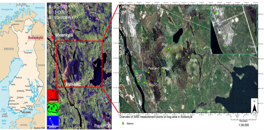 Test site location (red box) near the city of Sodankylä, Finland, and C-band RGB image of a Pauli decomposition showing the surroundings of the test site (R: Double bounce scattering, G: Volume scattering, B: Surface soil scattering) as well as a zoom into a modified aerial image of the local measurement locations (green circles) around the FMI-ARC within the test site (AWS, IOA, RefIOA, Forest, Peatland, Bog1, Bog2, Bog2G, Bog3); SWE = Snow Water Equivalent [18].
