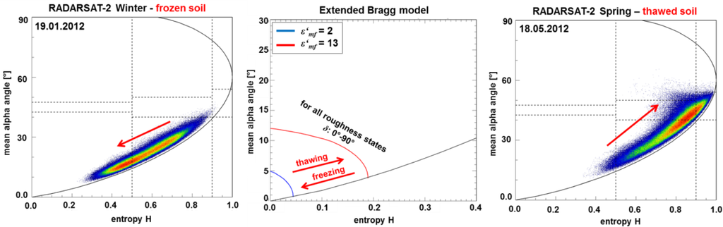 In addition, the analysis with the scattering mechanism classification for these H-α planes (dashed lines in Figures 8 and 10), proposed in [26] for L-band and shown in Figure 5, suggests a transition from volume-like scattering to surface-like scattering, when the soil freezes, and back under thawing conditions in April 2012. This confirms the model predictions in the methodology section. But as we are dealing with C-band data, this classification (developed originally for L-band wavelength) should give a first indication of possible physical scattering mechanisms and is still under investigation.