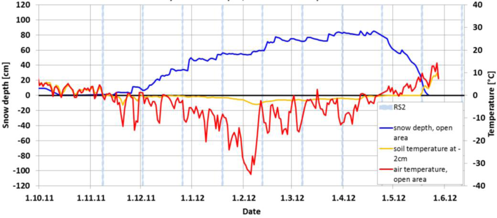 Snow depth (blue), air (red) and soil (orange) temperature curves recorded at the IOA measurement site (a forest clearing, where the ground vegetation consists of low lichen, moss and heather) for the entire winter period from snow accumulation starting in November 2011 until snow free periods in June 2012. The blue, vertical, dashed lines indicate the acquisition dates of RADARSAT-2: 8.11.11, 2.12.11, 26.12.11, 19.1.12, 12.2.12, 7.3.12, 31.3.12, 24.4.12, 18.5.12, 11.6.12 [19].