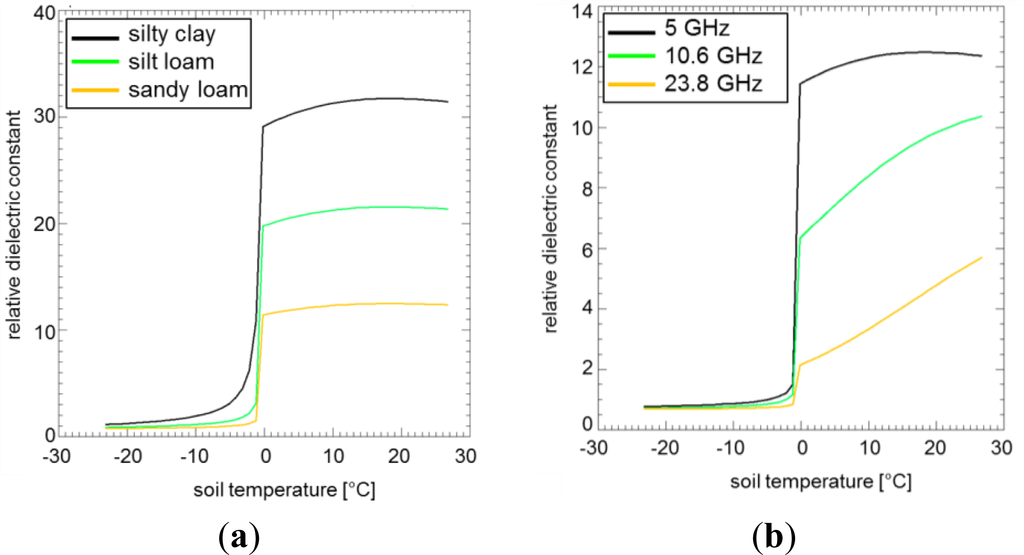 Figure 3 displays modeled phase transitions for different soils from silty clay to sandy loam as well as for different frequencies from C- to Ku-band. As soon as the soil temperature falls below zero degree Celsius, a distinct drop of ε′mf occurs for all soil types and all frequencies, which keeps the dielectric level close to the lower physical limit for all freezing states. Hence, this sharp decrease is expected to have an effect on the polarimetric observables to distinguish freezing and thawing states of the soil.