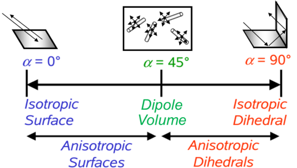 Physical meaning of the dominating intrinsic scattering mechanism expressed by the mean alpha scattering angle (ranging from surface scattering α = 0 to dihedral scattering α = π/2).