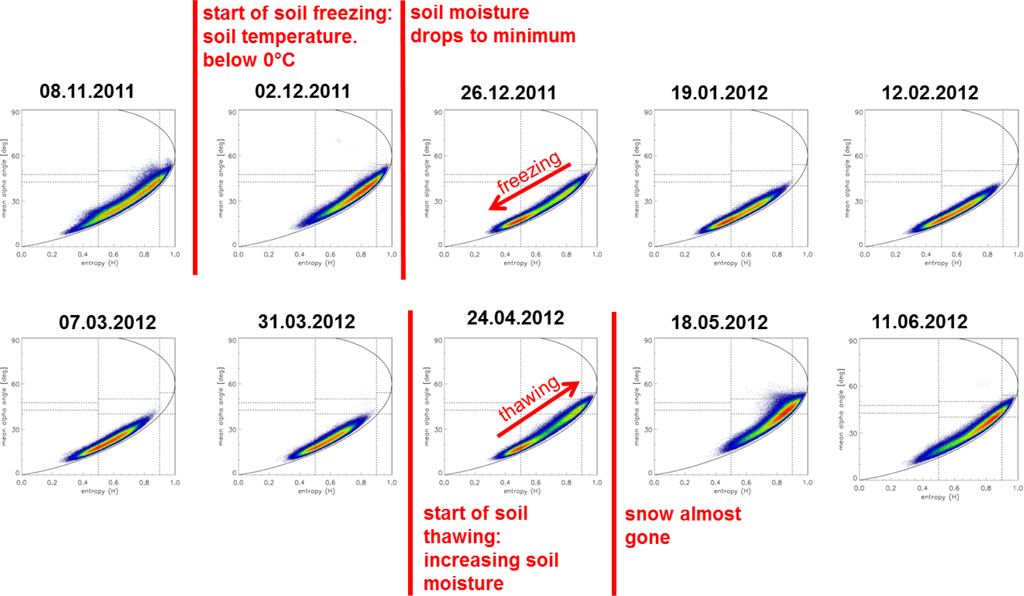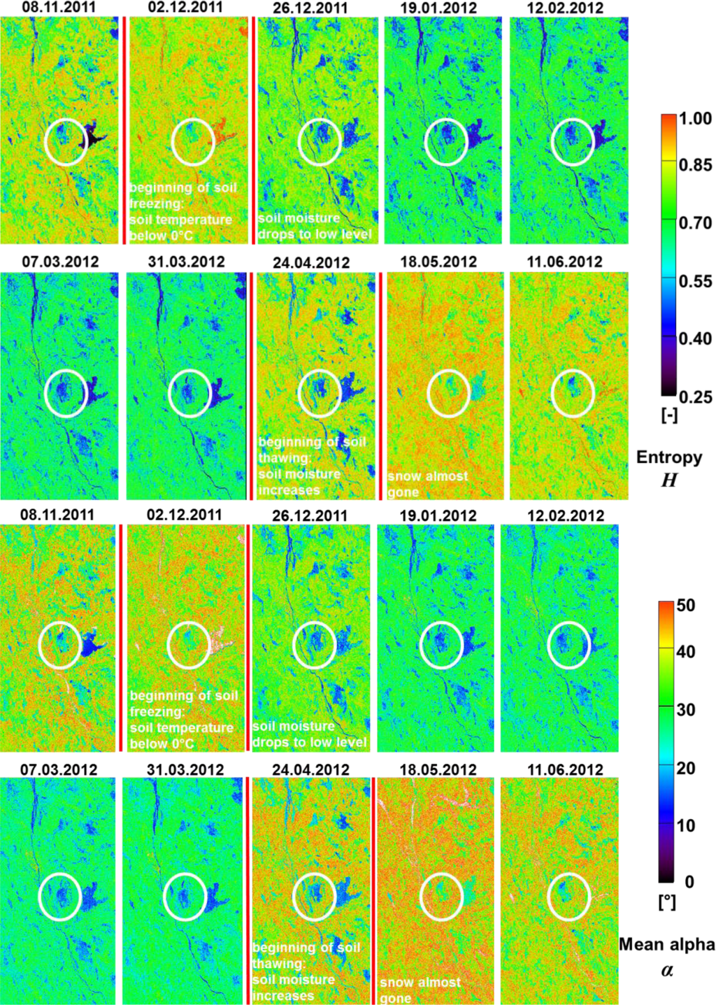 Concurrently, a decreasing trend of the eigen-based decomposition parameters during soil phase transition towards freezing (H→0.4–0.7, α→15°–30°) and an increasing trend for transition towards thawing (H→0.7–1.0, α→30°–50°) is apparent. The white circle in Figure 6 indicates the Sodankylä test site with similar dynamics.