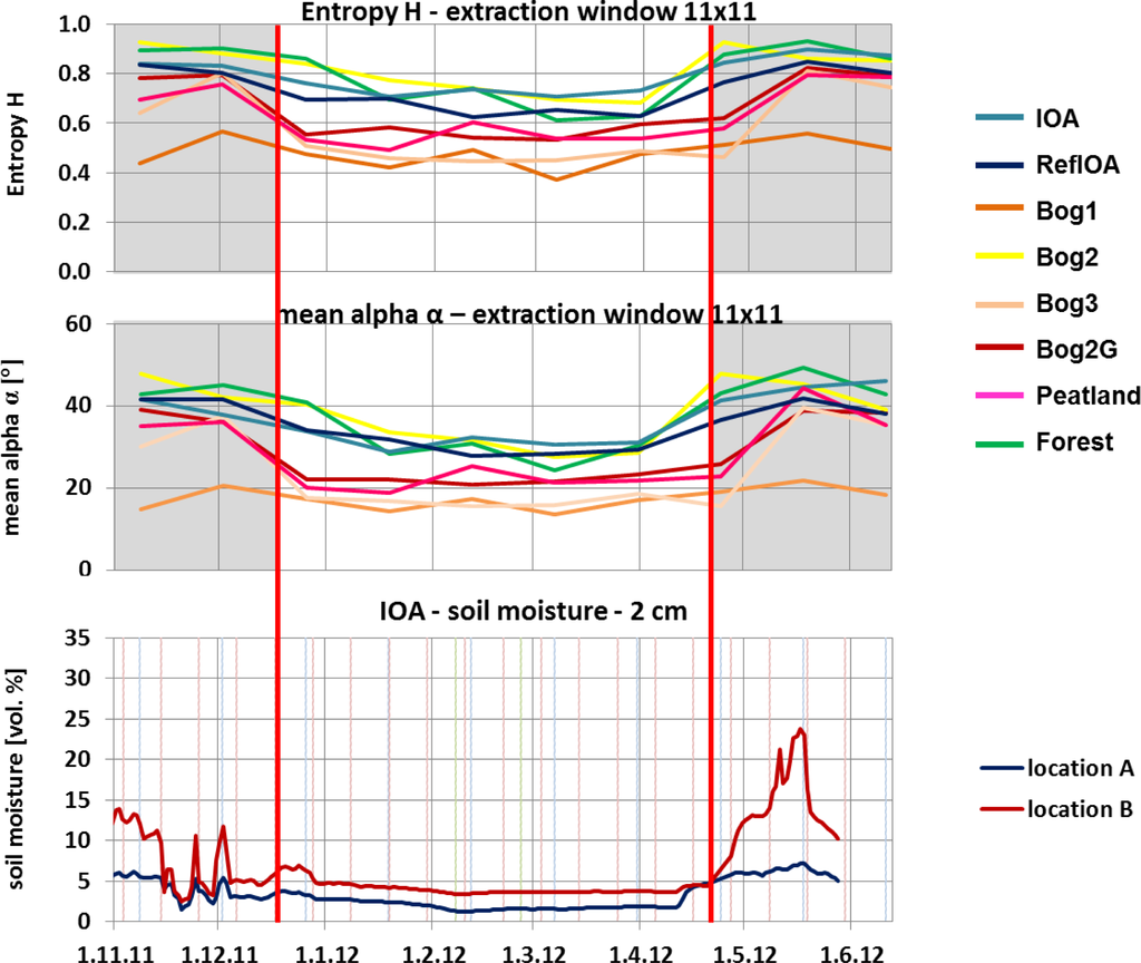 Analysis of polarimetric entropy and mean scattering alpha angle for different measurement locations (colors of curves) compared with soil moisture measurements at 2 cm depth from two continuously recording moisture sensors at location A and B within the IOA (bottom plot); Red vertical bars indicate the soil frost period.