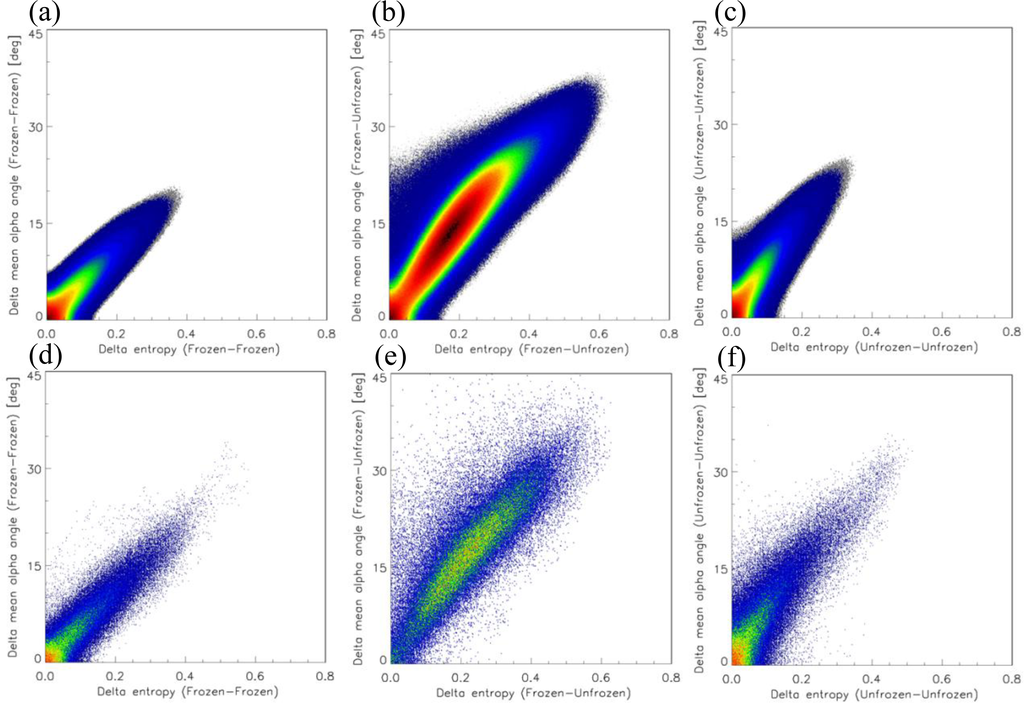 Comparison between the absolute difference of polarimetric entropy (delta entropy) and of mean scattering alpha (delta mean alpha angle) values of the entire RADARSAT-2 scene (a,b,c) and the peatland measurement site (d,e,f) for two soil states; (a,d): Frozen state (19.1.)–frozen state (12.2.); (b,e): Frozen state (12.2.)–unfrozen state (18.5.); (c,f): Unfrozen state (18.5.)–Unfrozen state (11.6.); The color inside the plots indicate the number of counts from low (gray-blue) to high (orange-red).
