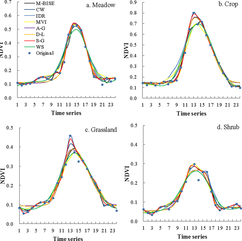 The technique performance differs based on the three evaluation indexes. For crop, desert, grassland and meadow, the optimal techniques are S-G, WS, S-G, and CW, respectively, in terms of the three evaluation indexes. However, the best technique is different for shrub in terms of the three evaluation indexes, the optimal technique is S-G for RMSE and AIC, while it is WS for BIC. At the same time, the worst technique is also different in terms of the three evaluation indexes, for the five vegetation types both RMSE and BIC indicate that IDR perform worst, while it is D-L for AIC. For all the eight techniques, the accuracy differs for different vegetation types. For example, the WS technique performs better than the D-L technique for shrub and desert areas, but the situation is reversed for other three vegetation areas. Overall, the S-G, CW and WS techniques are effective for the GIMMS NDVI time series data. The IDR, M-BISE, and MVI techniques perform worse than other techniques for most vegetation types. Evaluation indexes can affect the assessment results for some vegetation types.
