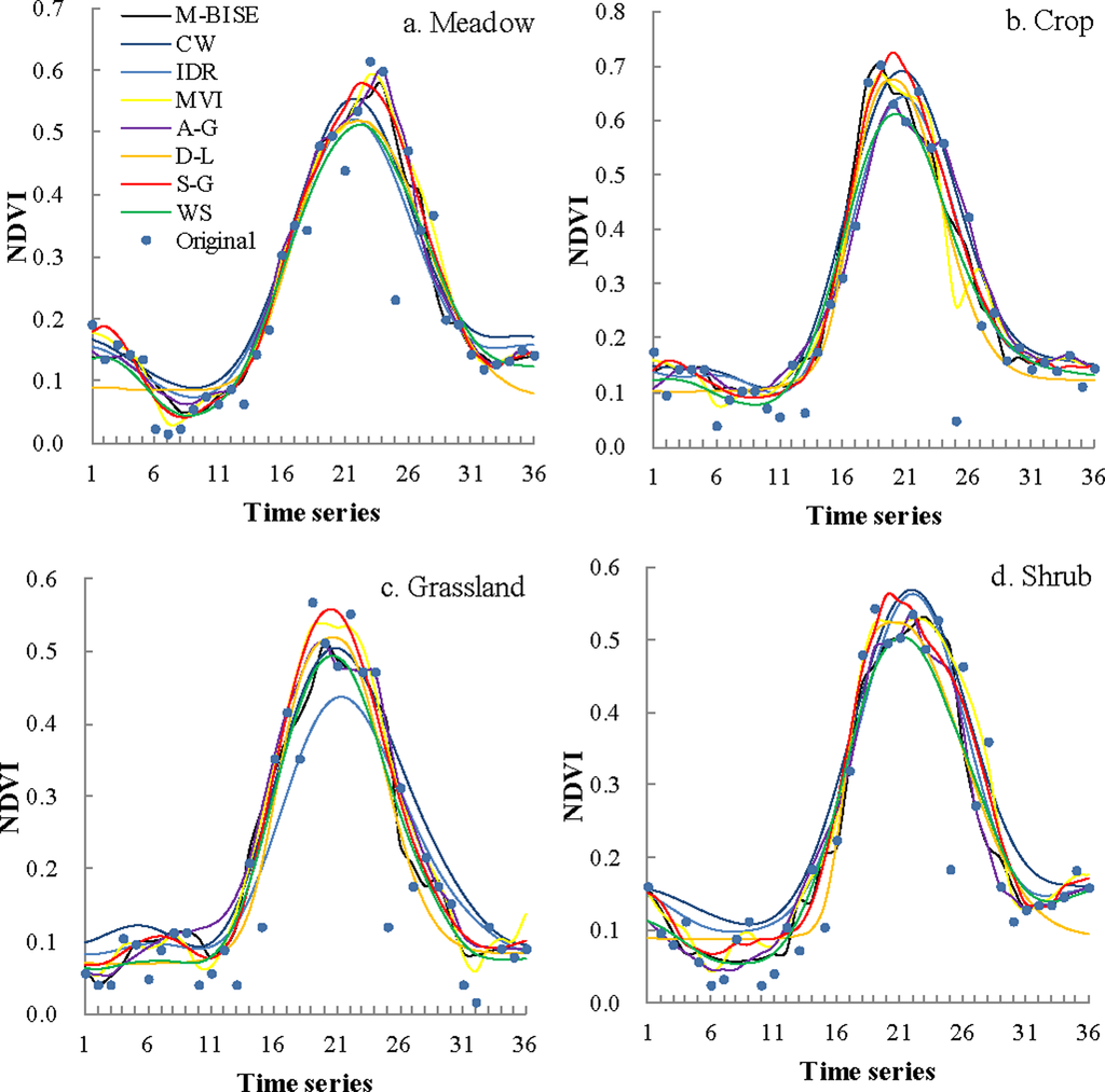 Although many studies have focused on NDVI noise reduction techniques comparison, there are still some aspects that need to be improved and completed. First, previous work has been restricted by a small selection of the available noise reduction techniques, and the majority of the literature compares two or three techniques, typically, single novel technique is compared to one or two widely-known techniques [15]. Only a few studies compare more than three techniques, such as the studies by Atkinson et al. [45], Hird and McDermid [15], and Jiang et al. [27]. Hird and McDermid [15] compared six NDVI de-noising techniques, two of which (the ARMD3-ARMA5 filter and the 4253H) were rarely used in the literature. Moreover, approximately ten new techniques have been developed in the last decade, and some of these new techniques have not been rigorously compared against other techniques, IDR has not been compared to A-G, and WS has not been compared to S-G, and CW. Second, previous comparisons have been focused on the pixels or regional scale, and few studies have paid attention to vegetation types, which could be important for selection optimum noise-reduction techniques [33,45]. Third, almost all noise-reduction technique comparisons have been based on one sensor. Few published studies have tested the differences between sensors. Finally, previous evaluations have principally relied on qualitative rather than quantitative assessments, and they generally have not addressed factors that could affect the performance of noise-reduction techniques [15]. Currently, few studies refer to the effects of different evaluation methods on assessment of outcome.
