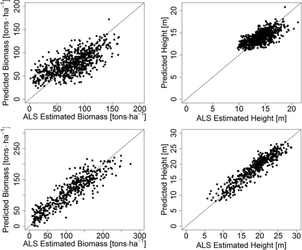 Scatter plots of AGB (Left) and H (Right) estimations for stands at the Krycklan (Top) and Remningstorp (Bottom) test sites.
