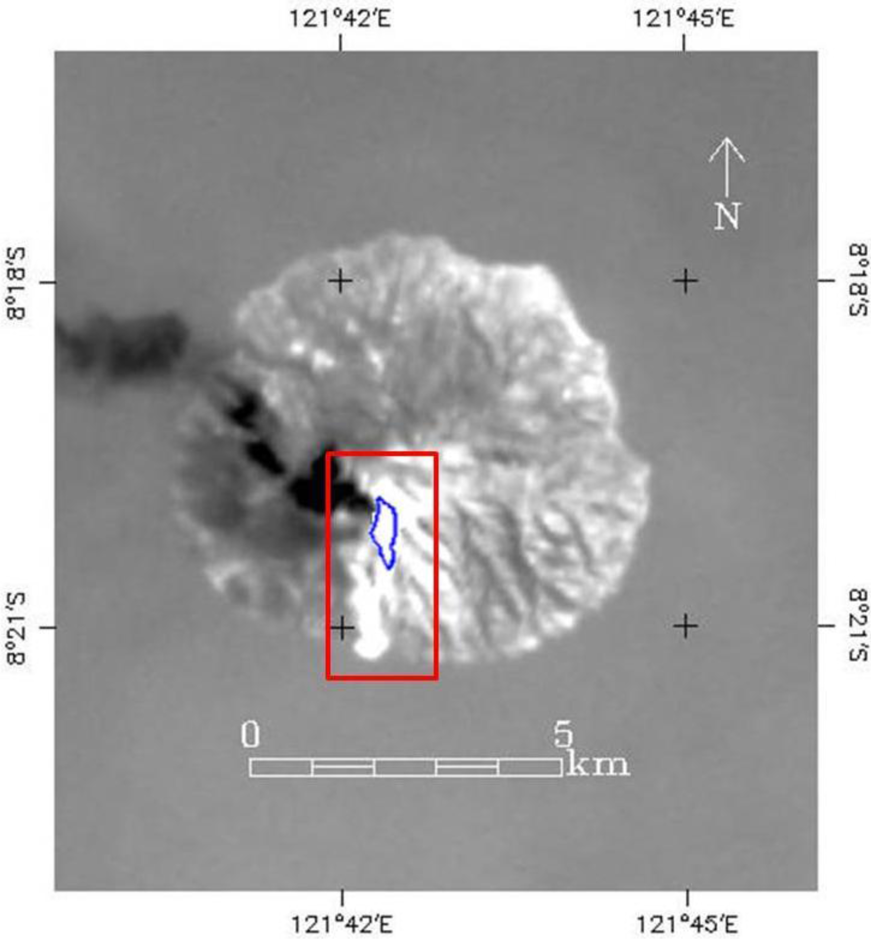 Landsat-8 band 10 image of Paluweh Volcano on 29 April 2013. The volcano forms an island in the Flores Sea to the north of the Indonesia island of Flores. Evident here are bright regions to the centre and south of the landform which constitute the thermally anomalous activity at the volcano. To the west, the plume emanating from the volcano can be seen as a darker (cooler) region. The rectangular region outlined in red is that which was extracted for analysis. It encompasses the anomalous volcanic radiant signals, here outlined in blue, and also a portion of the non-volcanically active surroundings and a small part of the associated ash plume. Image source: [28].